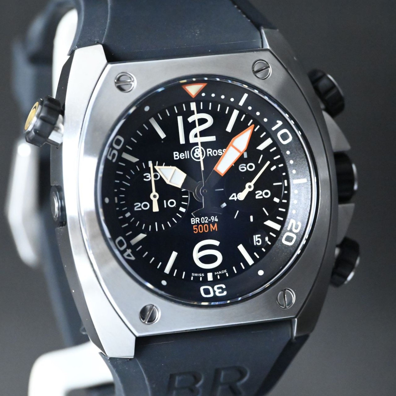 The Bell & Ross BR 02-94 Marine Chronograph is special because it combines a bold square case with real dive watch performance. It offers strong water resistance, clear legibility underwater, and a useful chronograph function. Its unique shape stands out from traditional round dive watches.