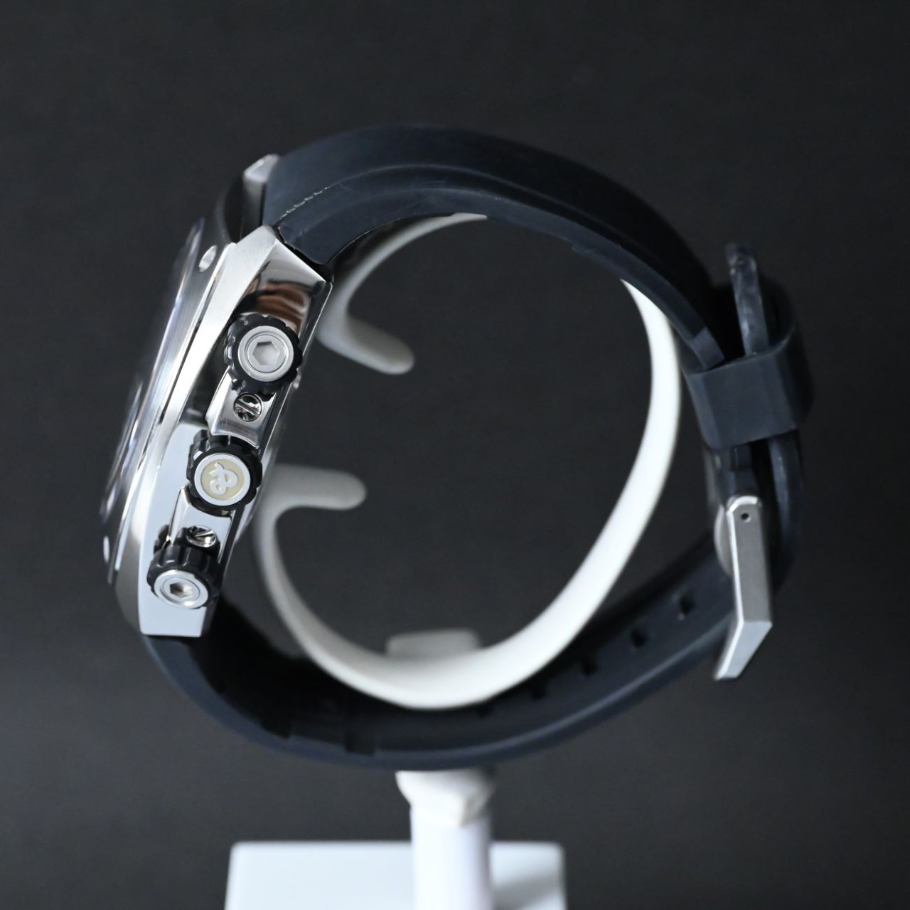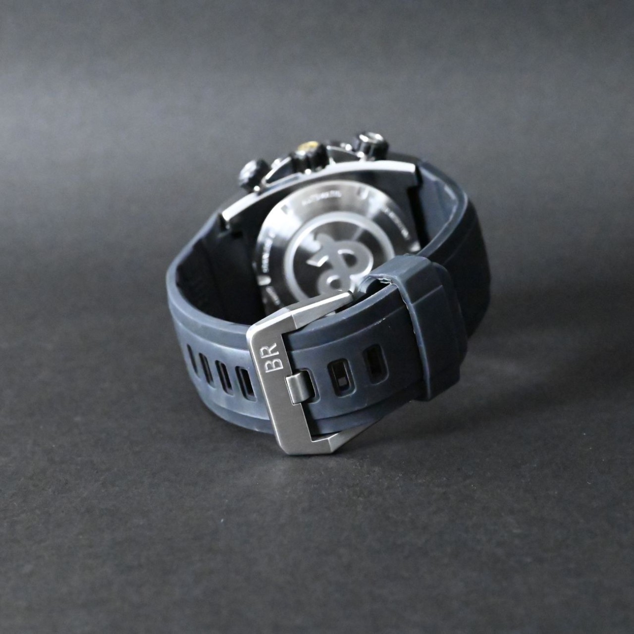 The Bell & Ross BR 02-94 Marine Chronograph has a bold and functional design. The dial is clean and highly legible, with large luminous markers and clear subdials for timing. The stainless steel case has a distinctive rounded-square shape and feels solid on the wrist. A thick sapphire crystal protects the dial and adds durability. The watch usually comes on a rubber strap or steel bracelet, both built for comfort and water use.