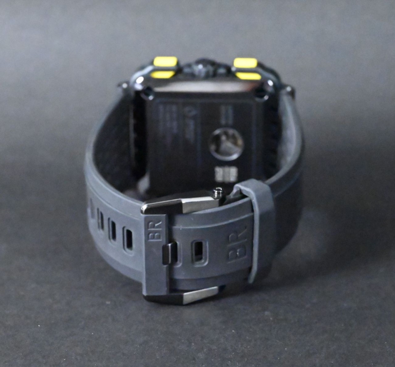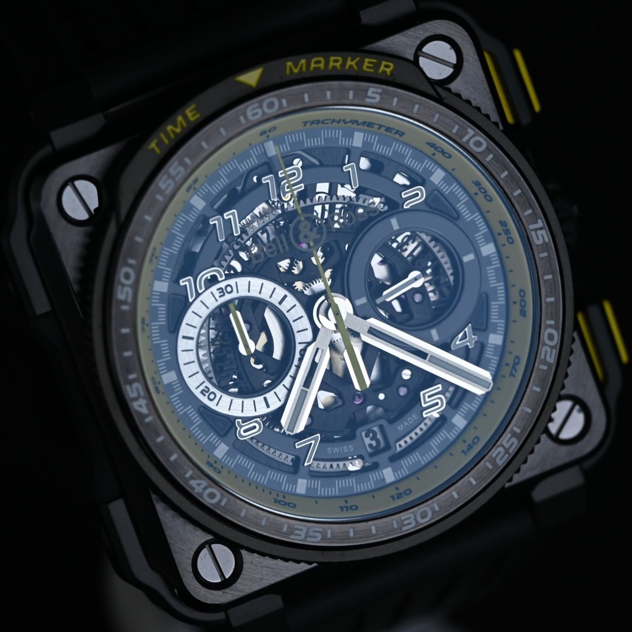 Design – Dial, Case, Crystal & Strap The Bell & Ross BR-X1 R.S.20 has a bold skeleton dial that lets you see through into its inner mechanism. The hour markers and hands are metal with Super-LumiNova® lume so you can read the time even in low light. The 45 mm case uses lightweight, strong materials like satin-polished titanium, ceramic and rubber that protect the watch and give it a high-tech look inspired by racing cars. The crystal on top is sapphire with an anti-reflective coating, so it stays clear in many light conditions and resists scratches. Instead of a metal bracelet, the watch comes with a perforated black rubber strap that feels sporty and sits comfortably on the wrist, finished with a steel buckle with rubber overmoulding.