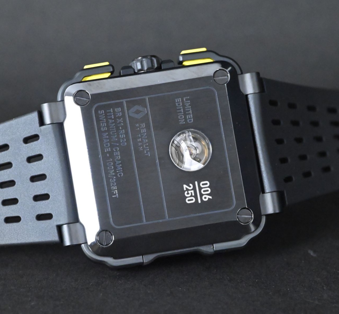 History of This Model The BR-X1 R.S.20 is part of Bell & Ross’s R.S.20 collection, created in partnership with the Renault F1 Team. The “R.S.” stands for Renault Sport, linking the watches to high-performance racing design and materials. Bell & Ross started this collaboration in 2016 and has released special editions each year, drawing on the engineering and style of Formula 1 cars. The BR-X1 R.S.20 itself is a limited-edition model — just 250 pieces were made — and it brings the brand’s experimental, high-tech BR-X1 design into the sports chronograph space with a skeletonised dial and race-inspired look.