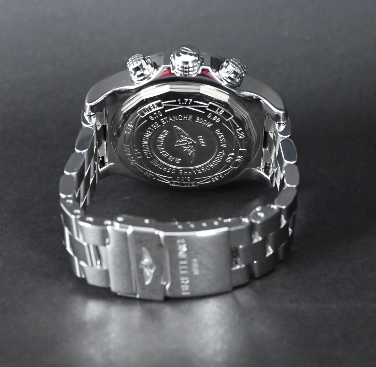 Inside, the watch uses the Breitling Caliber 13 automatic movement. This movement is based on the reliable ETA Valjoux 7750 and offers chronograph and date functions. It delivers about 42 hours of power reserve and is certified as a chronometer, which means it meets strict accuracy standards. The movement is known for its durability and ease of servicing, making it a practical choice for a large sports chronograph like this.