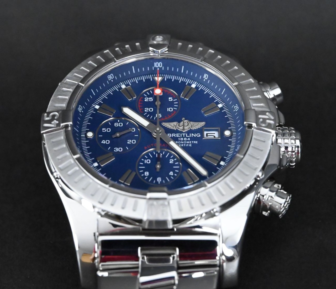 The Breitling A13370 Super Avenger Blue Dial stands out for its bold size, strong build, and clear design. It offers a reliable automatic chronograph movement and excellent legibility. The watch feels tough and precise, making it popular with people who want a large, sporty luxury watch that performs well every day.