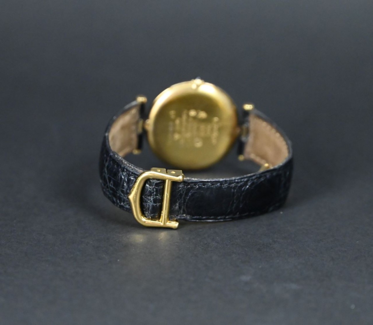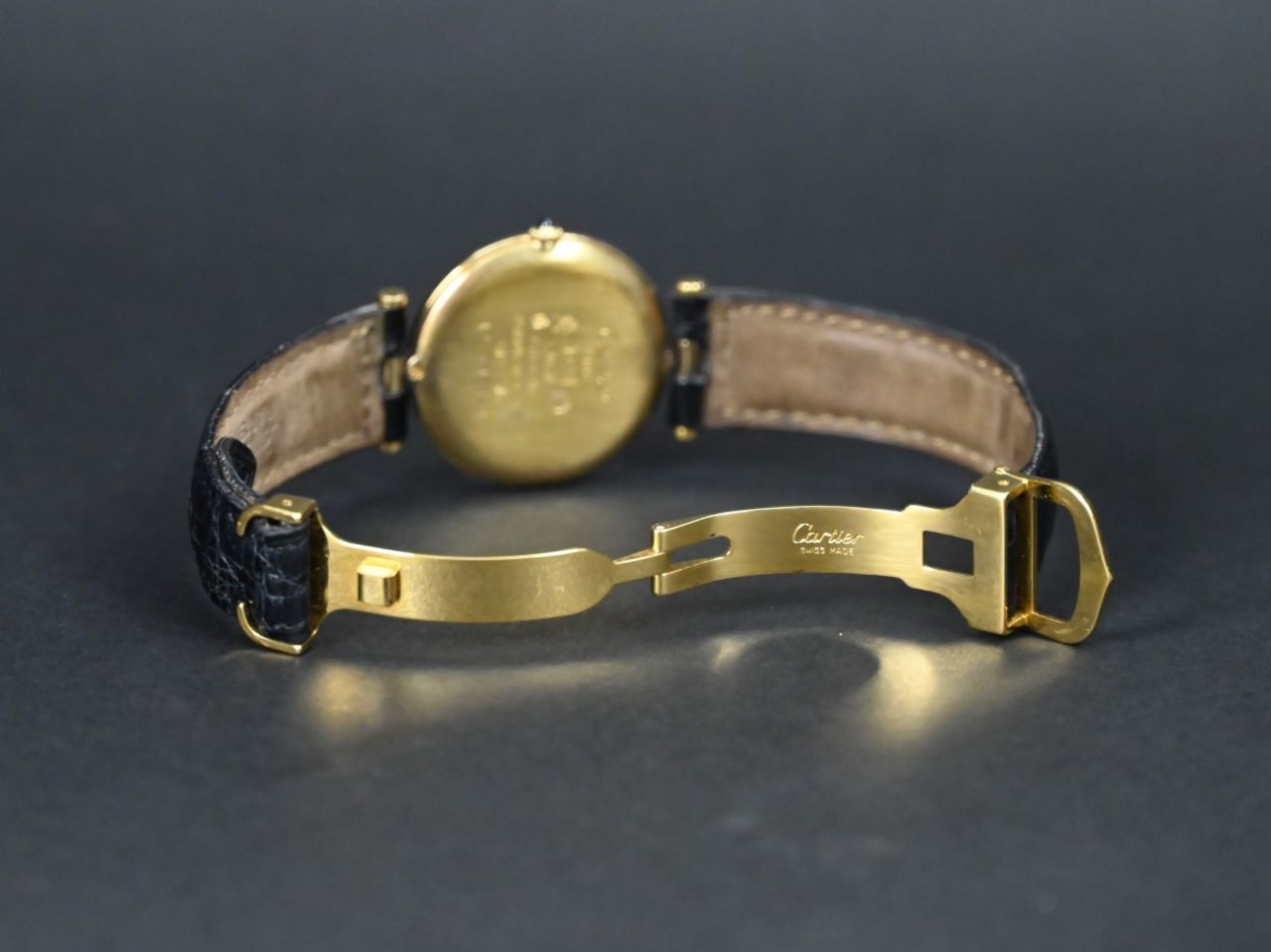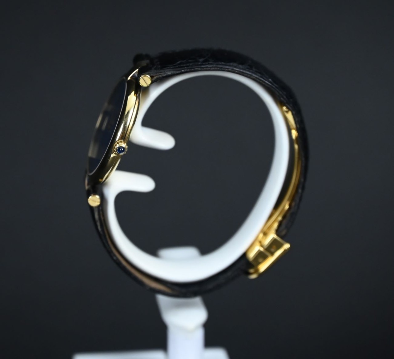 Inside is a reliable quartz movement. It keeps accurate time with little effort from the wearer and requires only occasional battery changes. The movement keeps the watch thin and light, making it comfortable for long wear. Cartier’s quartz calibres from this era are known for strong reliability, so the watch offers practicality along with luxury styling.