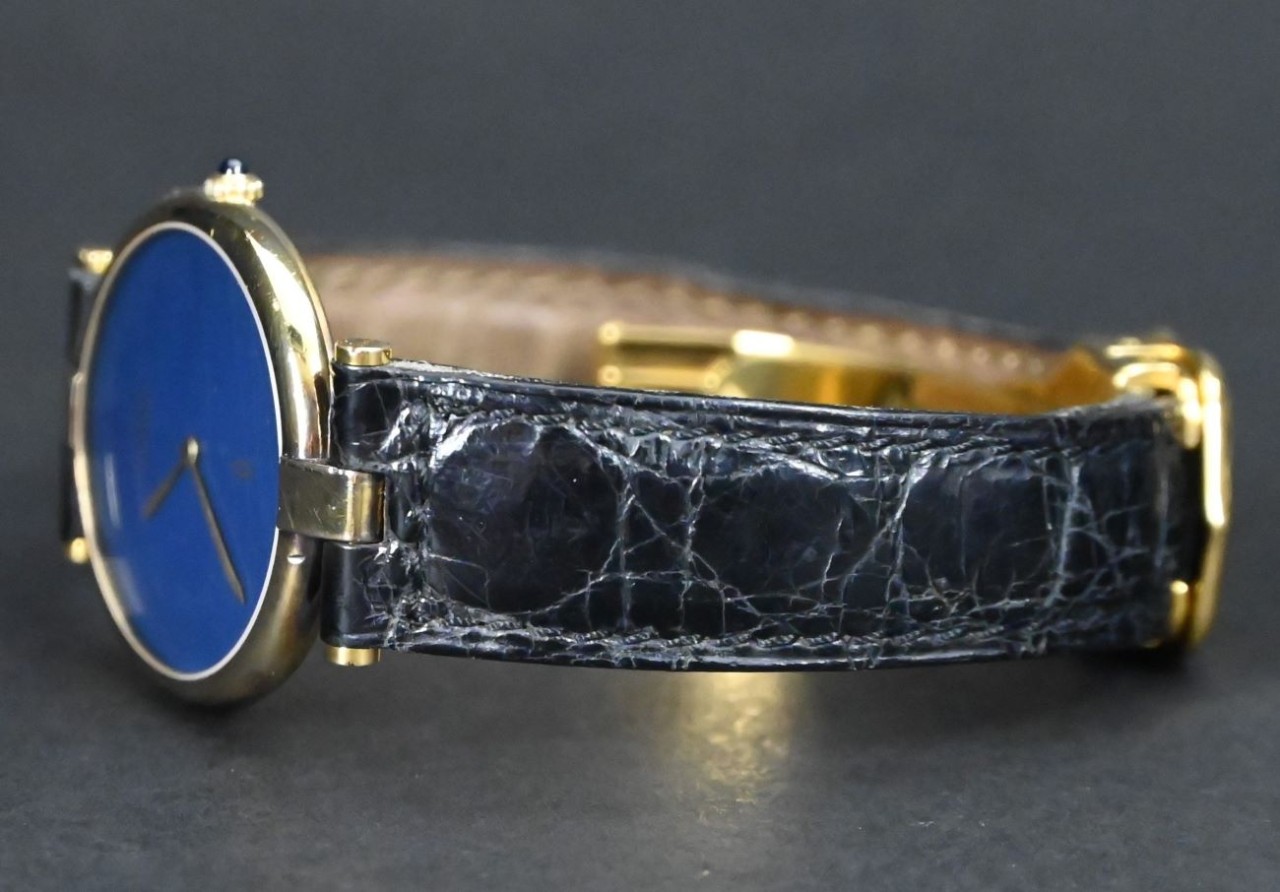 The Cartier Vermeil Must Vendome 59003 has a clean, elegant look that shows Cartier’s classic design language. Its round dial is simple and uncluttered, with slim Roman numerals and blued hands that stand out clearly. The gold-plated vermeil case has a smooth, polished finish that gives the watch a warm, refined presence on the wrist. A mineral crystal covers the dial and offers good everyday protection. The bracelet, typically a matching gold-tone or leather strap depending on the variant, adds to the watch’s timeless and understated style.