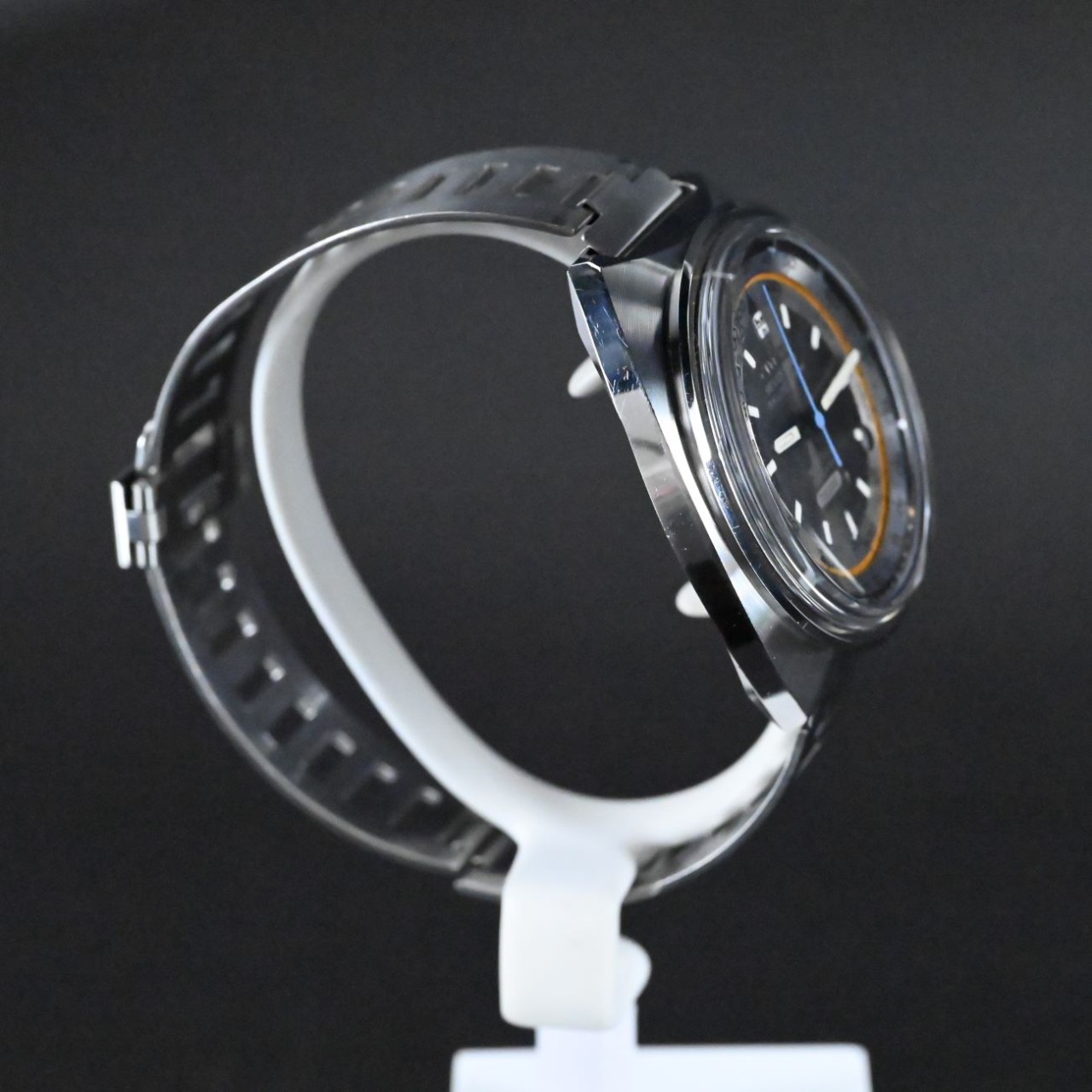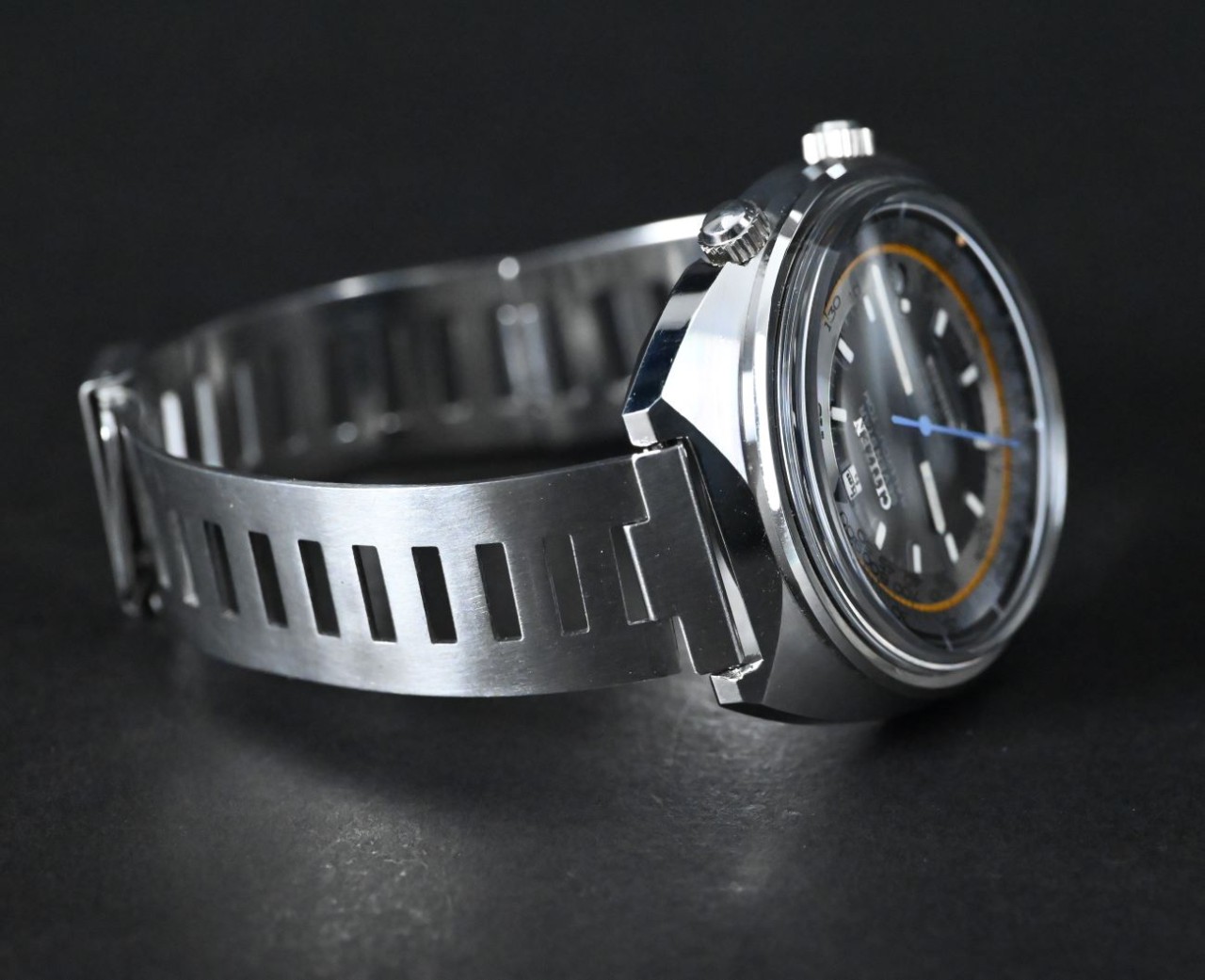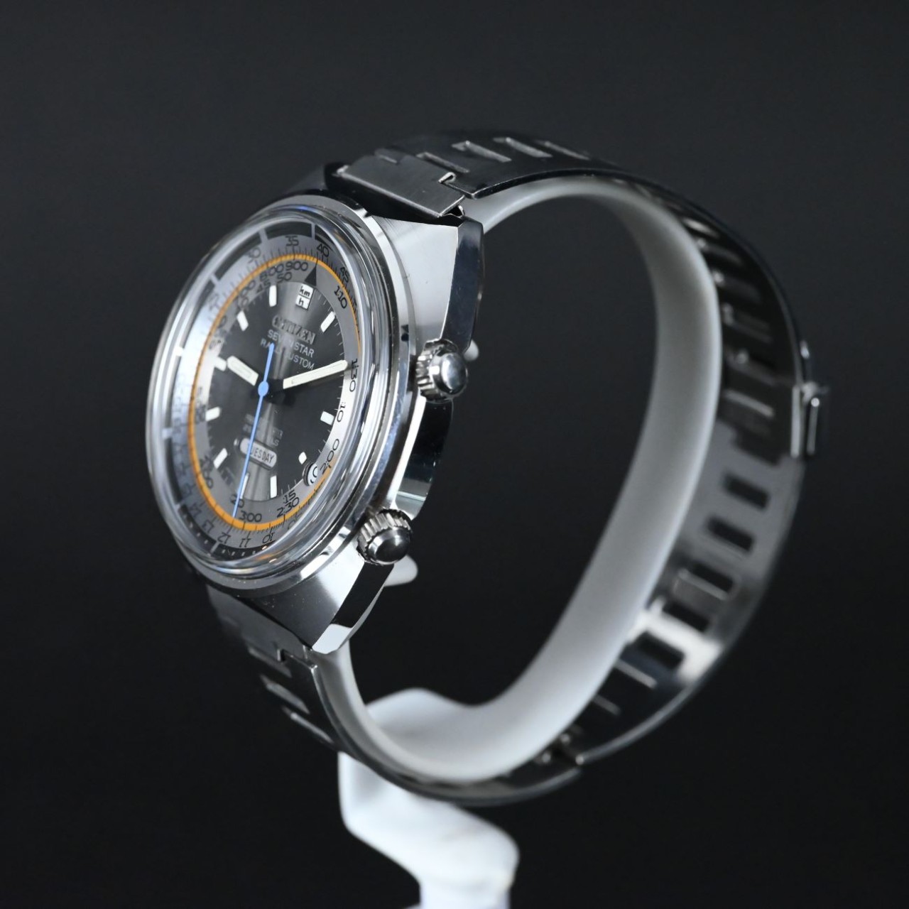 This watch stands out because it mixes bold 1970s racing style with a practical inner rotating bezel and a striking multi-coloured dial. It also uses an in-house automatic movement, making it a distinctive and collectible Citizen sport model