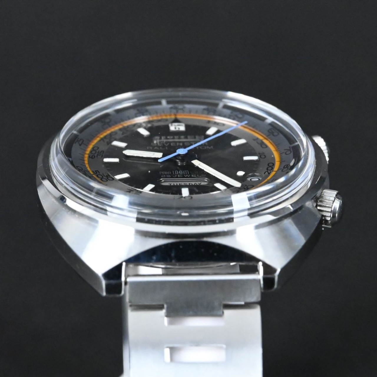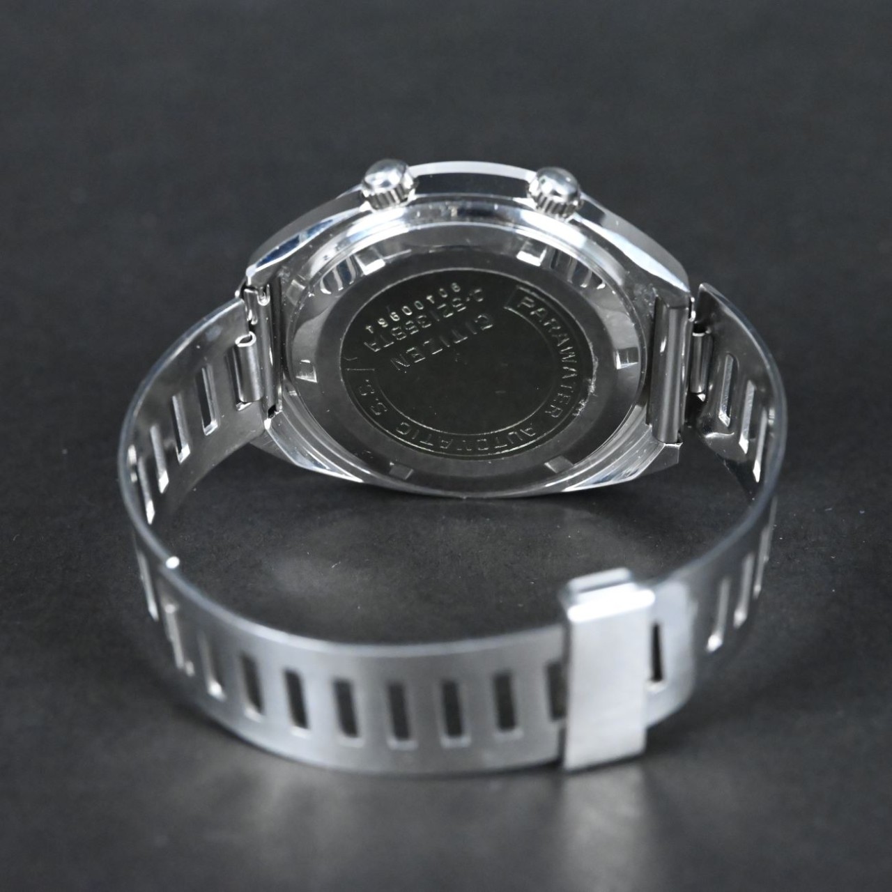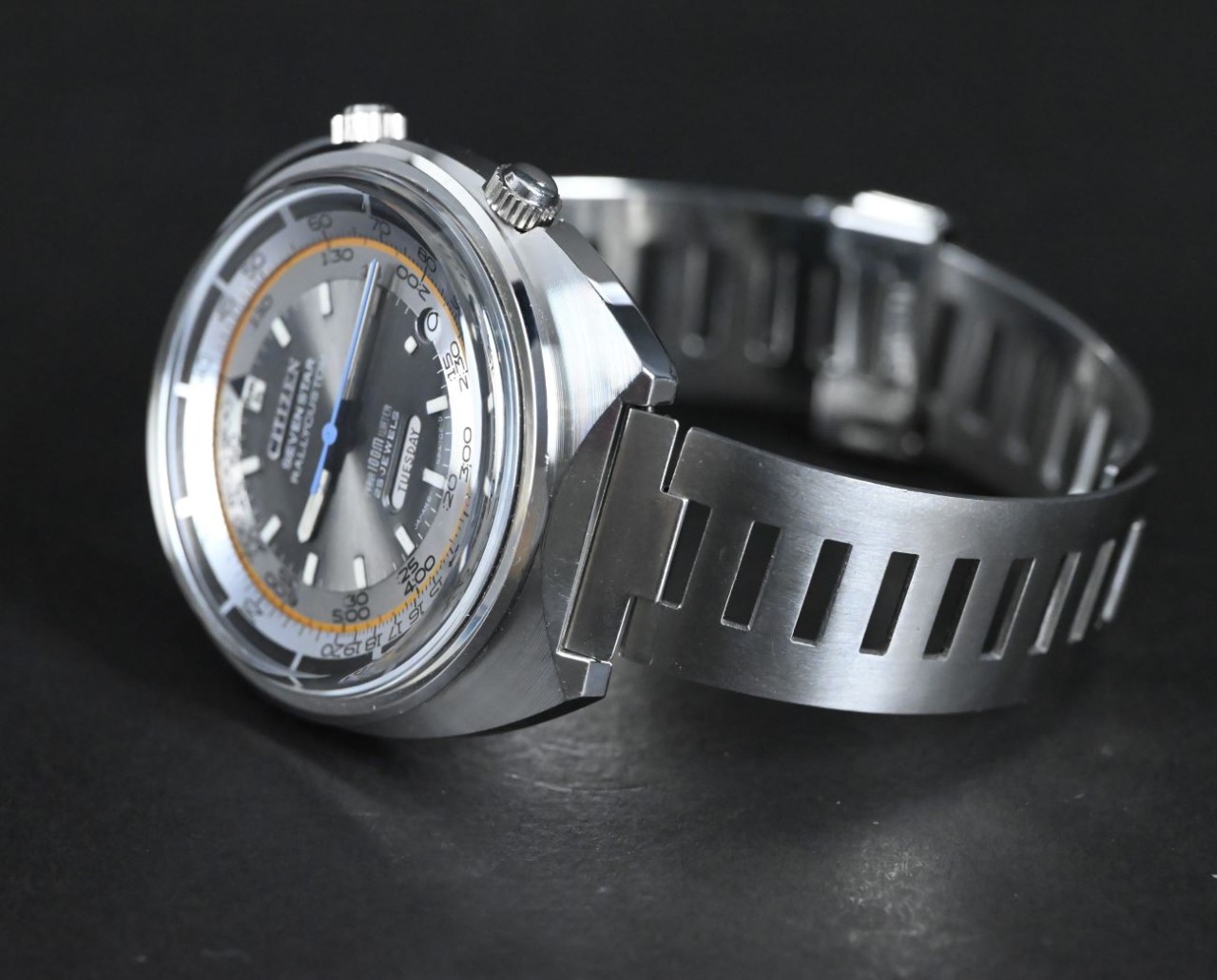 This watch stands out because it mixes bold 1970s racing style with a practical inner rotating bezel and a striking multi-coloured dial. It also uses an in-house automatic movement, making it a distinctive and collectible Citizen sport model
