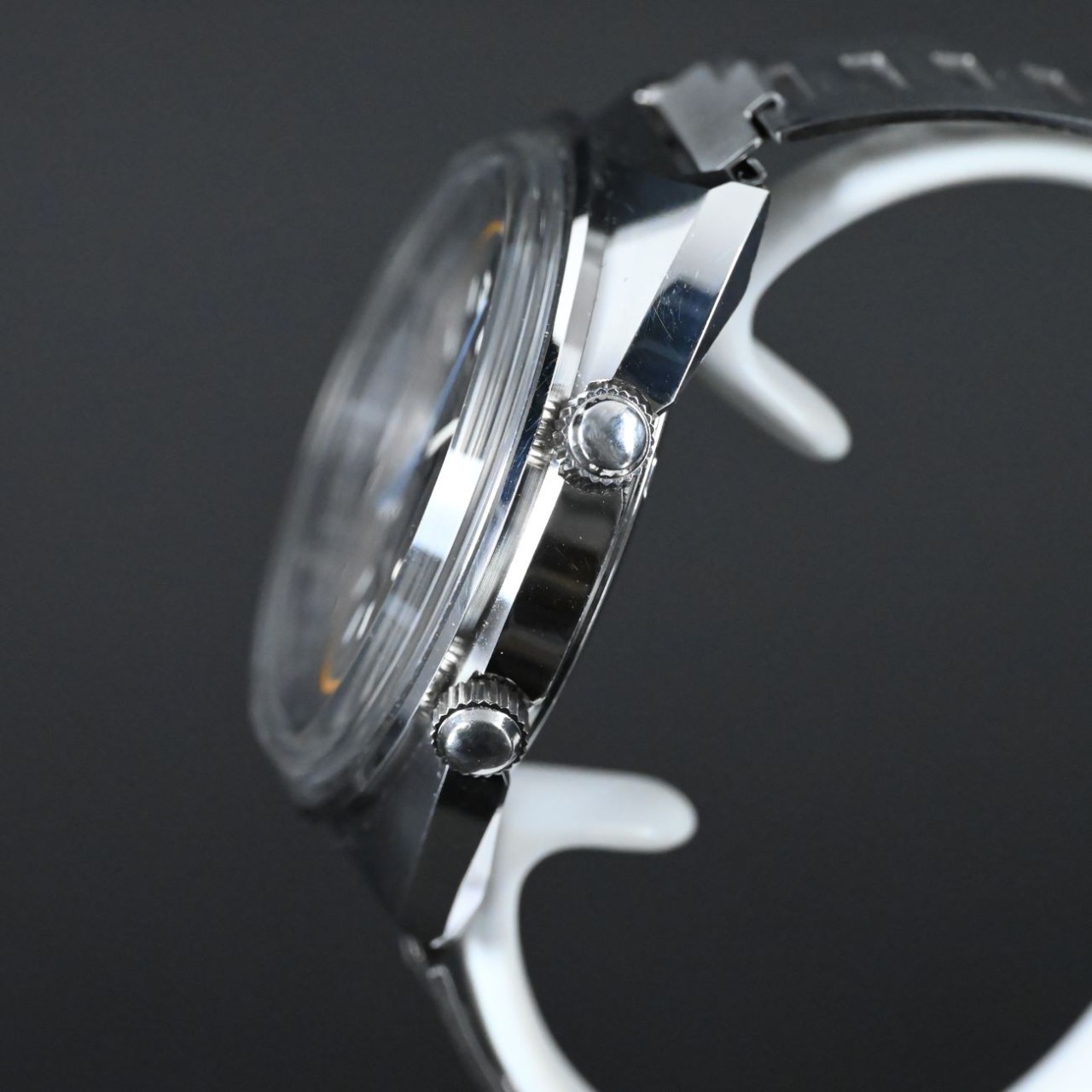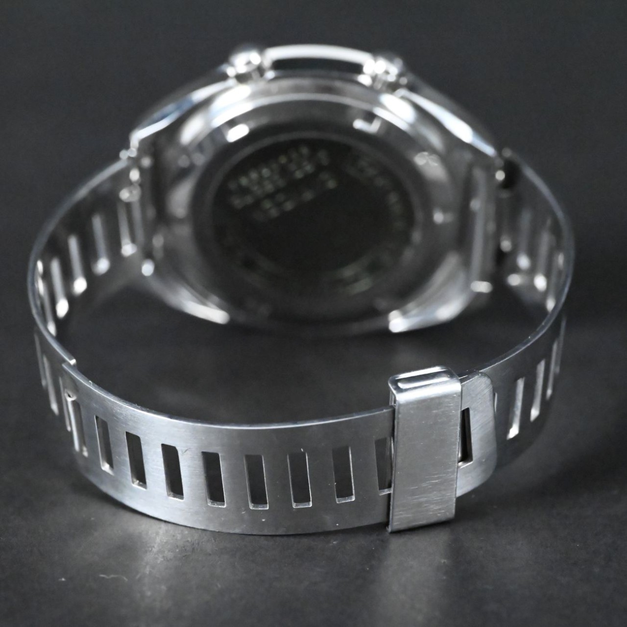 In terms of looks and build, the watch has a stainless-steel case and bracelet which give it a solid, substantial feel. The case is quite generously sized (around 42 mm) and has a mix of brushed and polished finishes on the top and sides — a nicely balanced combination that delivers a rugged yet refined presence. The crystal is domed acrylic (typical of its era), which adds a warm, slightly curved look to the dial beneath. On the dial you’ll find a sunburst-style centre (often in grey), with a rotating inner bezel operated via a second crown — a neat functional detail. The dial often carries subtle accents (such as a hint of orange) that bring a touch of sportiness to the otherwise reserved face. The bracelet is simple, sturdy, and matches the case well, making the watch feel cohesive and vintage-authentic