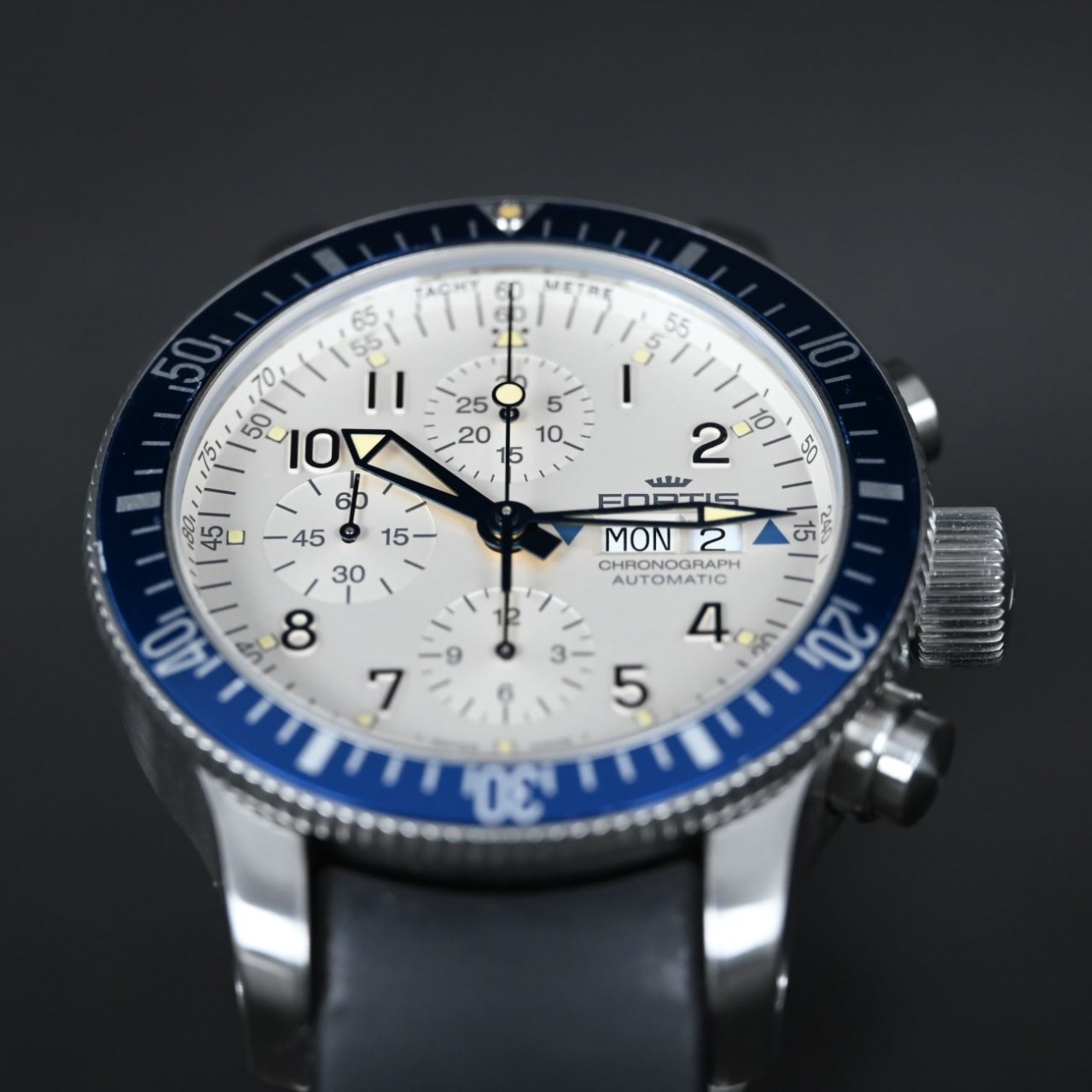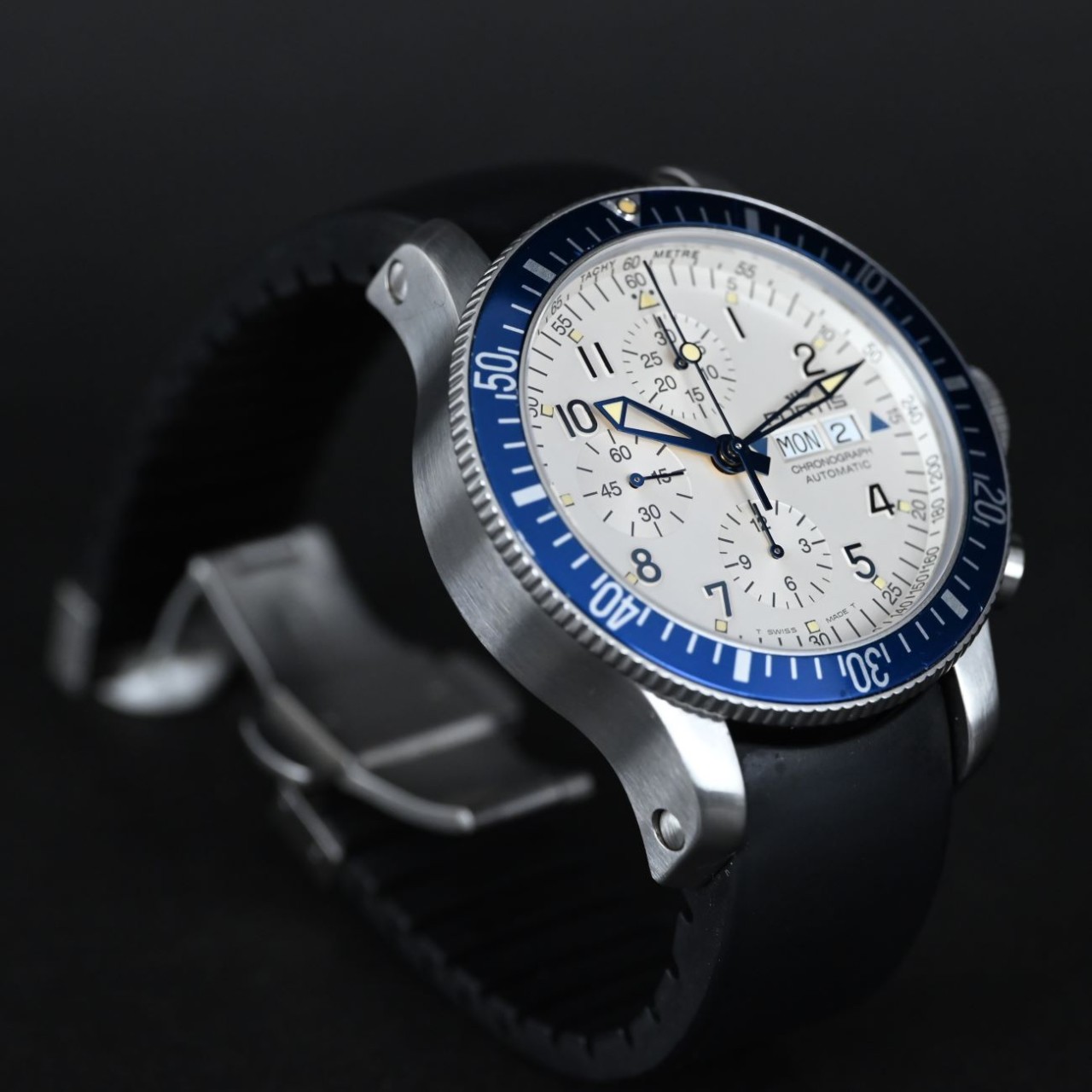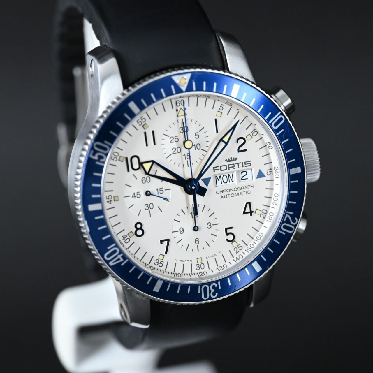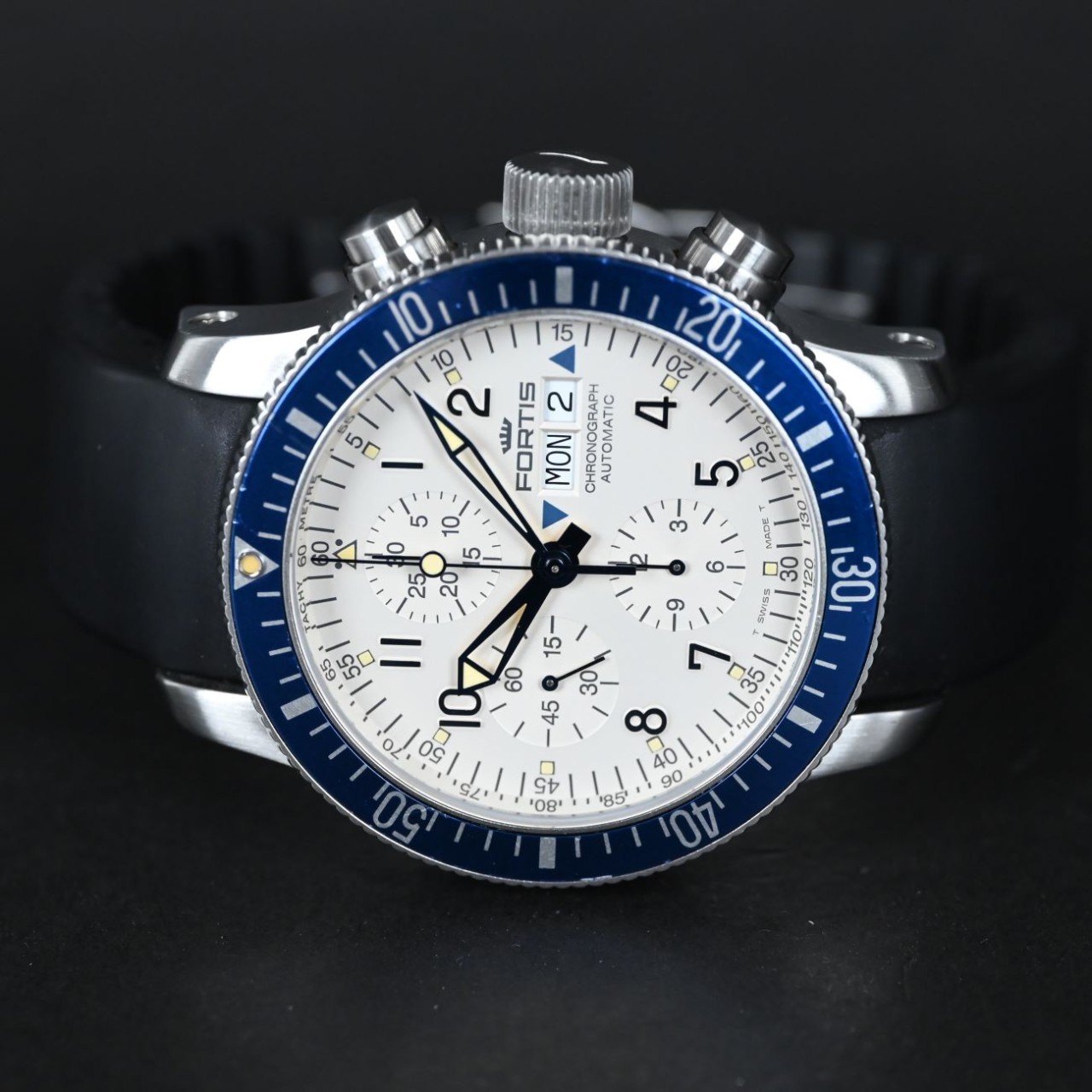 The Fortis B-42 Marinemaster Diver Chronograph Lot10208 Ref. 640.10.141 stands out because it pairs a bold pilot/diver style with Swiss automatic chronograph precision, offering clear timing functions, strong water resistance, and a rugged design that feels purposeful and sporty.