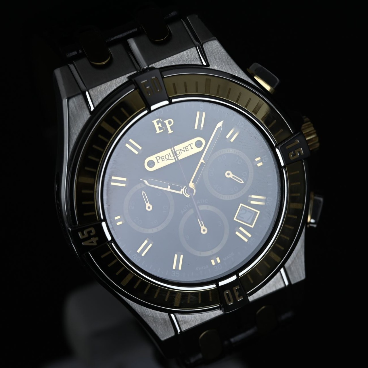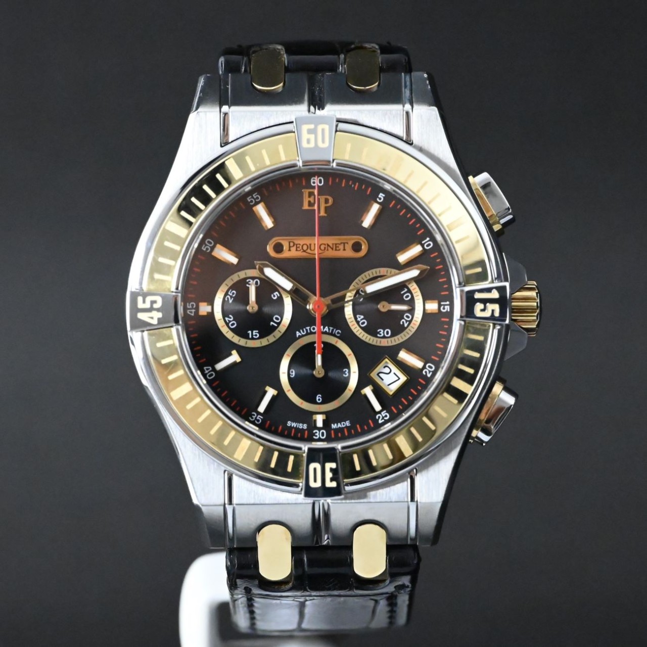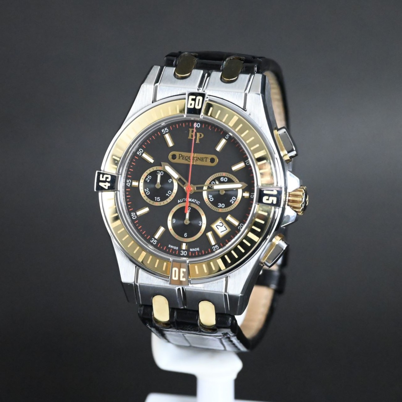 This watch stands out for its bold two-tone style, distinctive Moorea bracelet links, and clear display of its Swiss automatic chronograph movement. It mixes strong design with refined detailing, giving it a unique character within the Pequignet collection