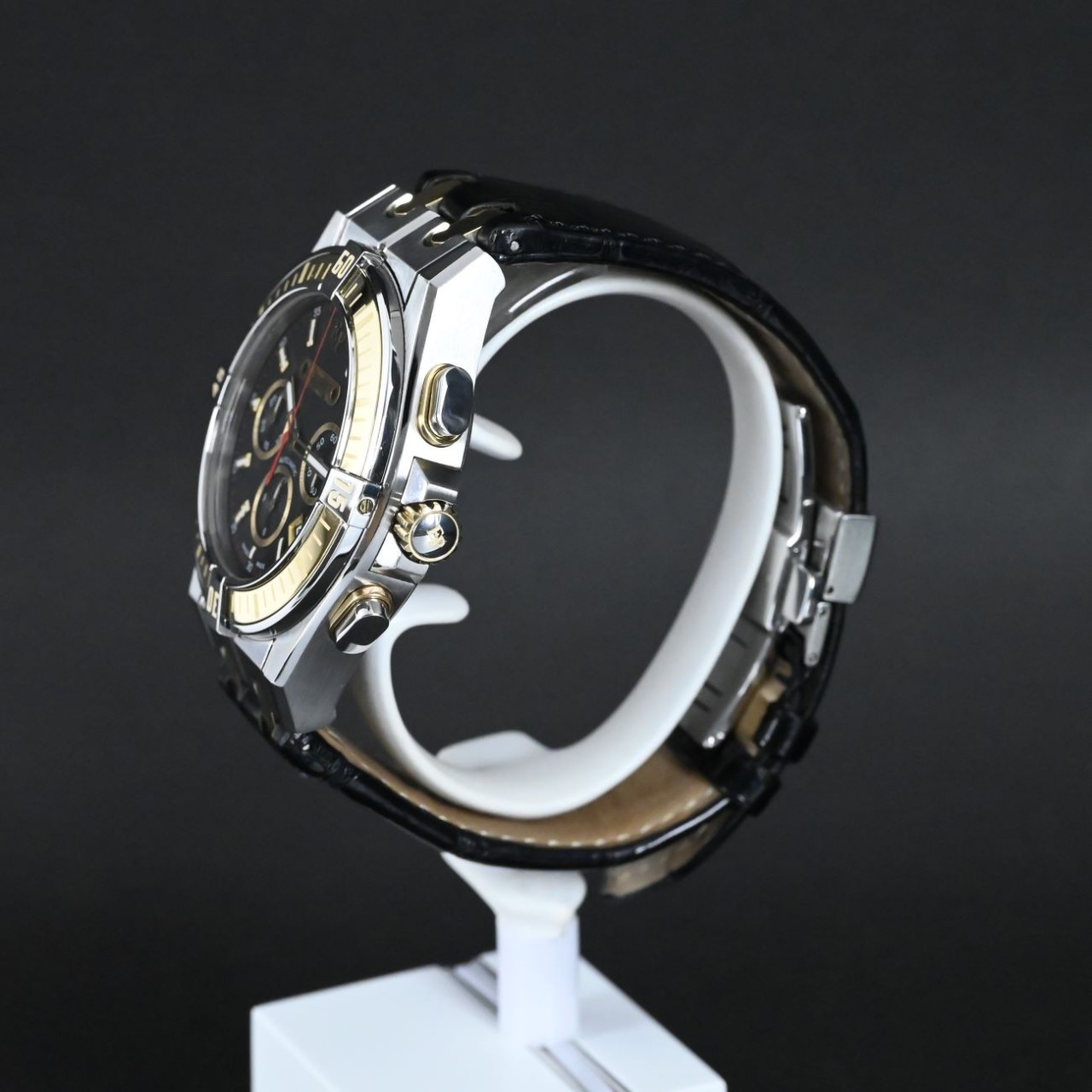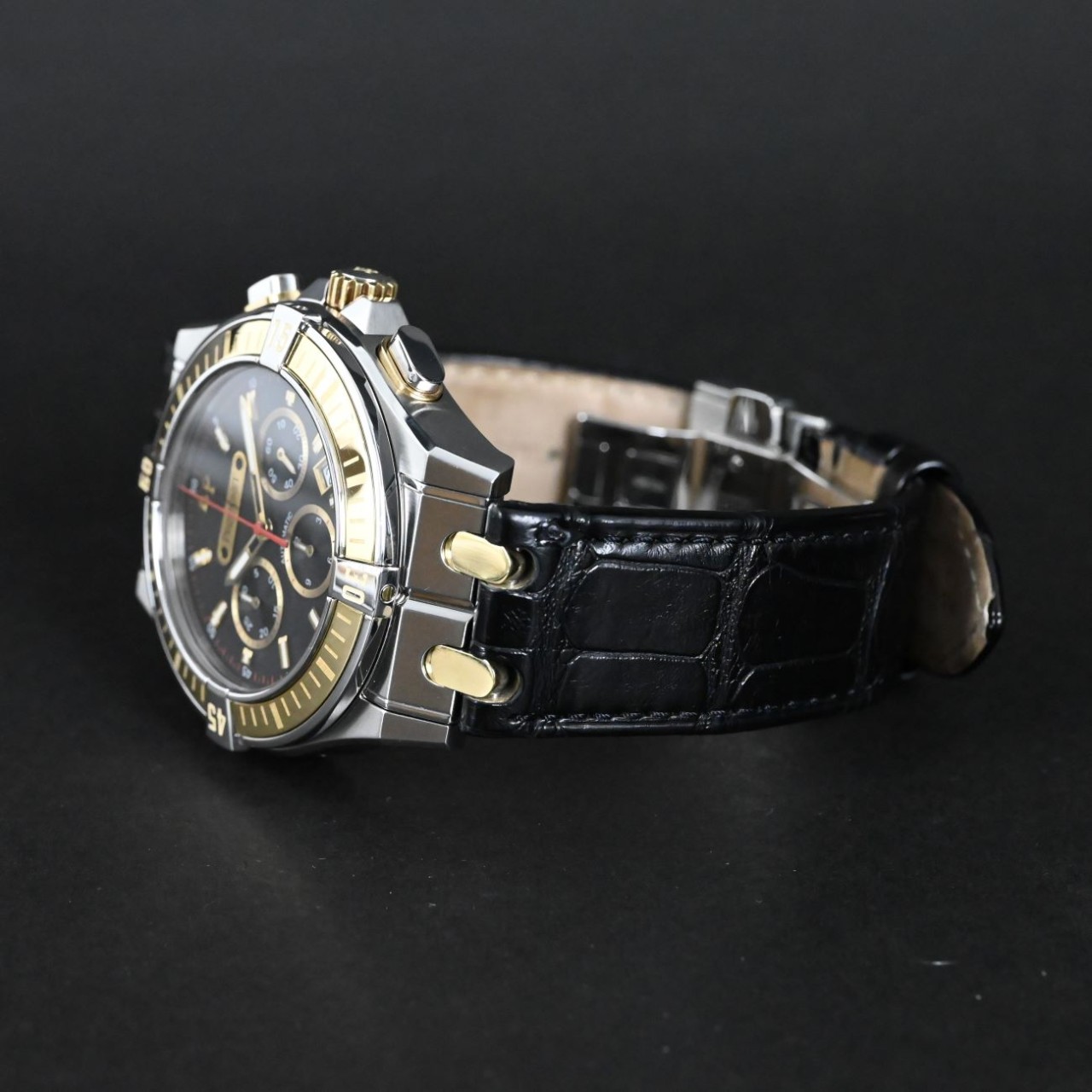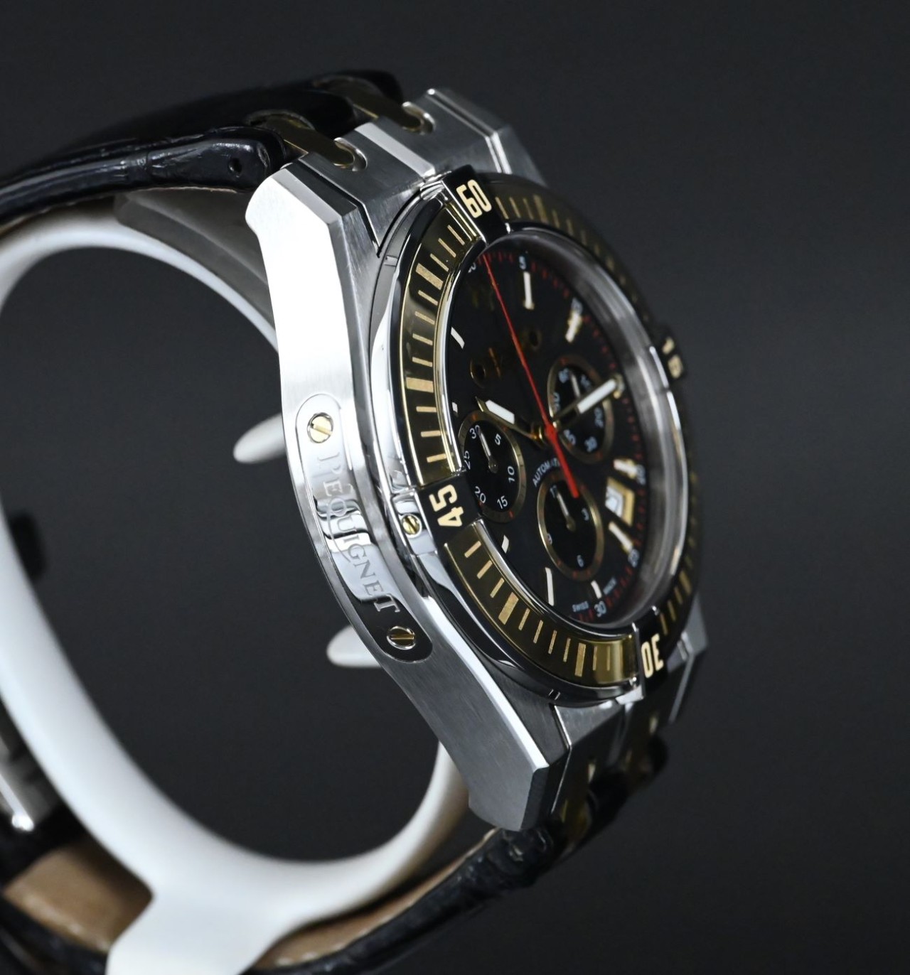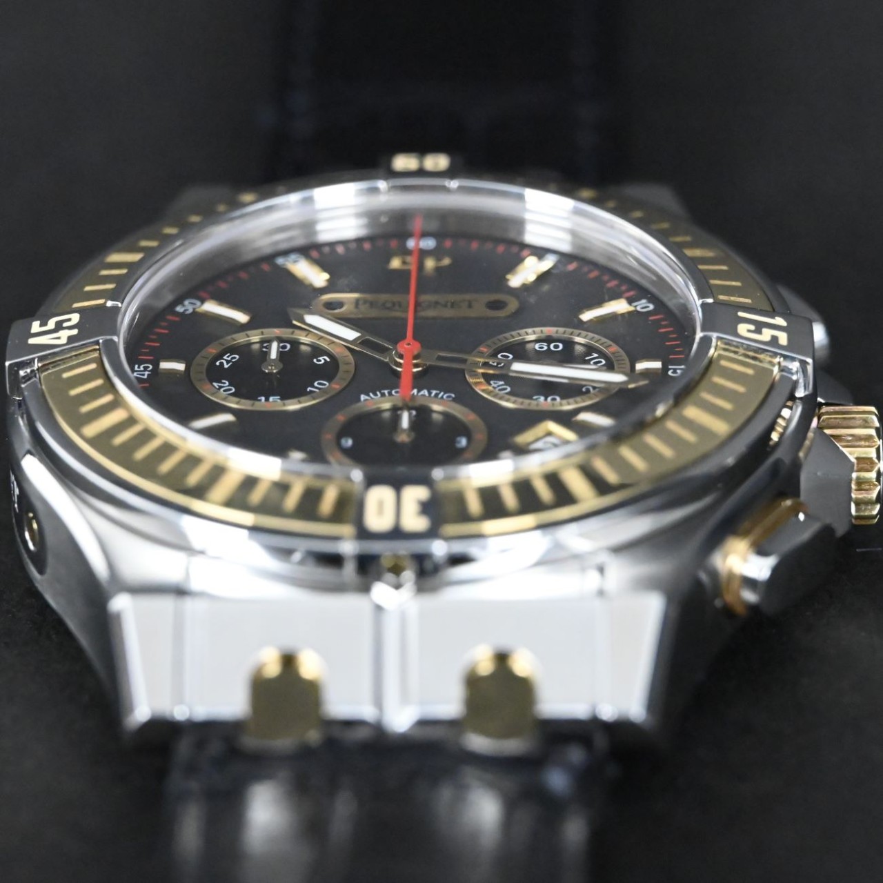 This watch stands out for its bold two-tone style, distinctive Moorea bracelet links, and clear display of its Swiss automatic chronograph movement. It mixes strong design with refined detailing, giving it a unique character within the Pequignet collection