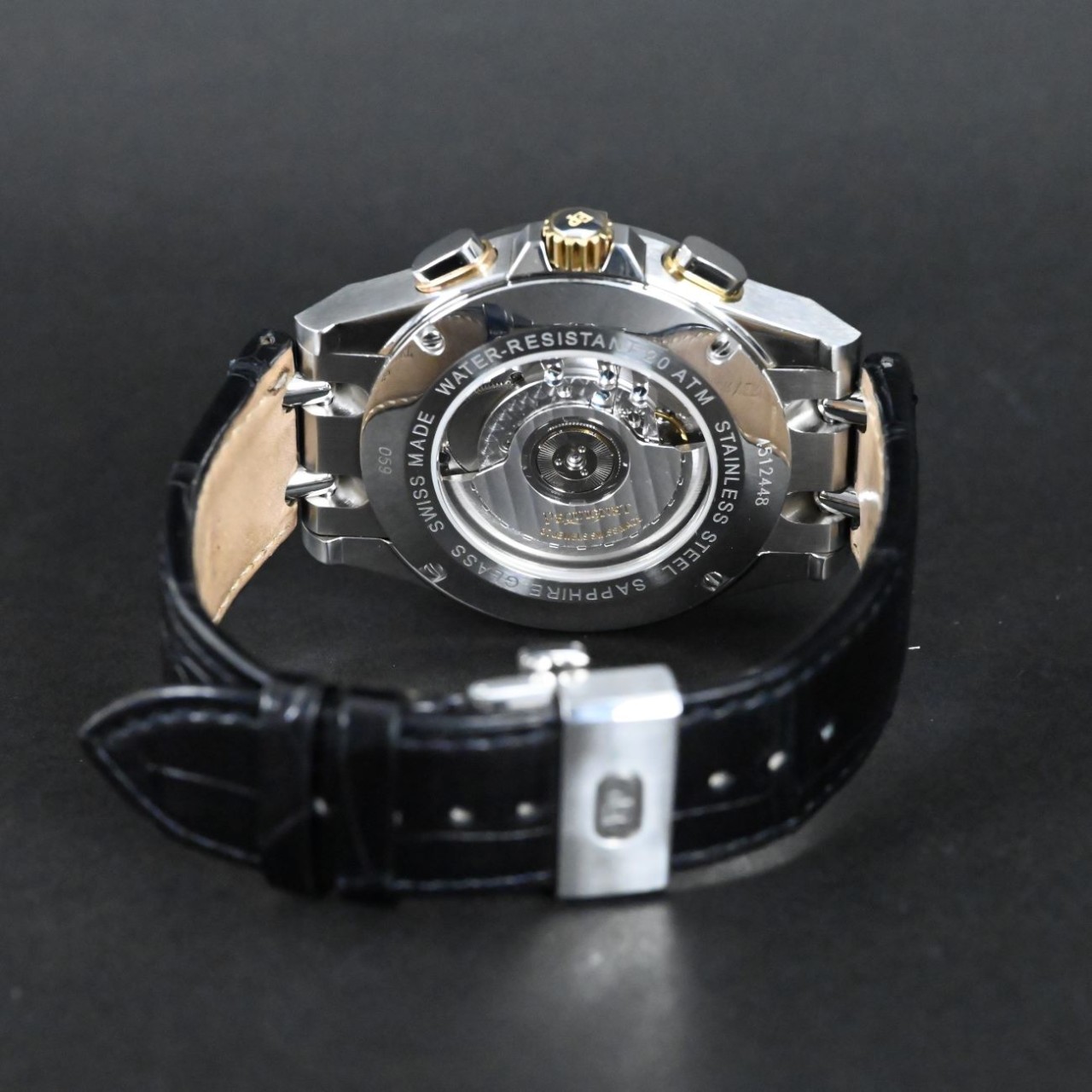 The movement is visible through the sapphire caseback, showing off its decorated rotor and clean finishing. It is a Swiss automatic chronograph movement with 27 jewels, built to run reliably with everyday use. The rotor winds smoothly with wrist motion, and the chronograph pushers operate with a crisp and positive feel. The movement’s layout, seen from the front, is neatly arranged with running seconds at six, a 30-minute counter at three, and a 12-hour counter at nine