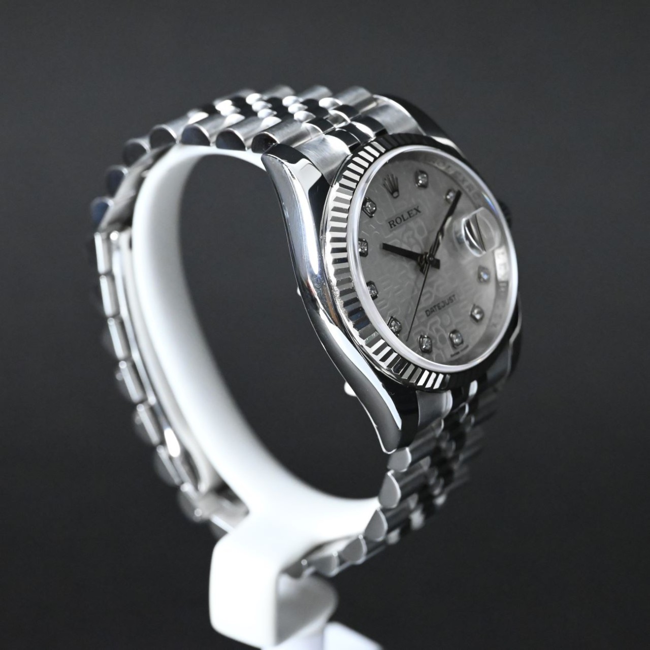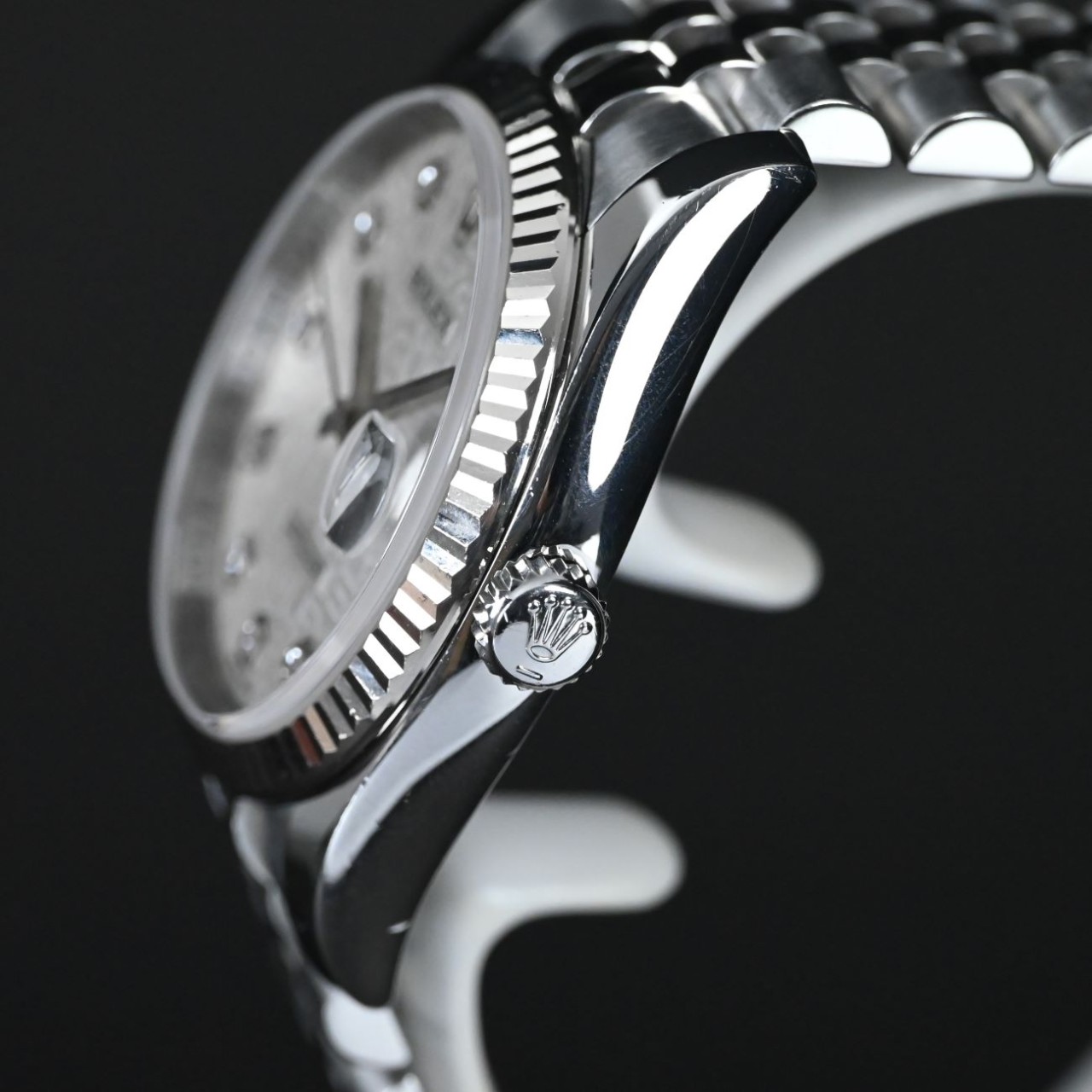The Rolex Datejust 116234 with a Jubilee bracelet and diamond dial stands as one of the brand’s most recognisable and refined modern classics. It brings together the strengths that define Rolex: confident design, durable engineering, and subtle luxury. The watch immediately draws the eye with its polished white-gold fluted bezel, a signature feature that catches light with every small movement. Its diamond-set dial adds an extra touch of sophistication, giving the watch a sense of quiet glamour while still remaining suitable for daily wear. The combination of stainless steel and white gold, often referred to as Rolesor, offers both robustness and elegance, making this model ideal for those who want a watch that feels special yet practical.
