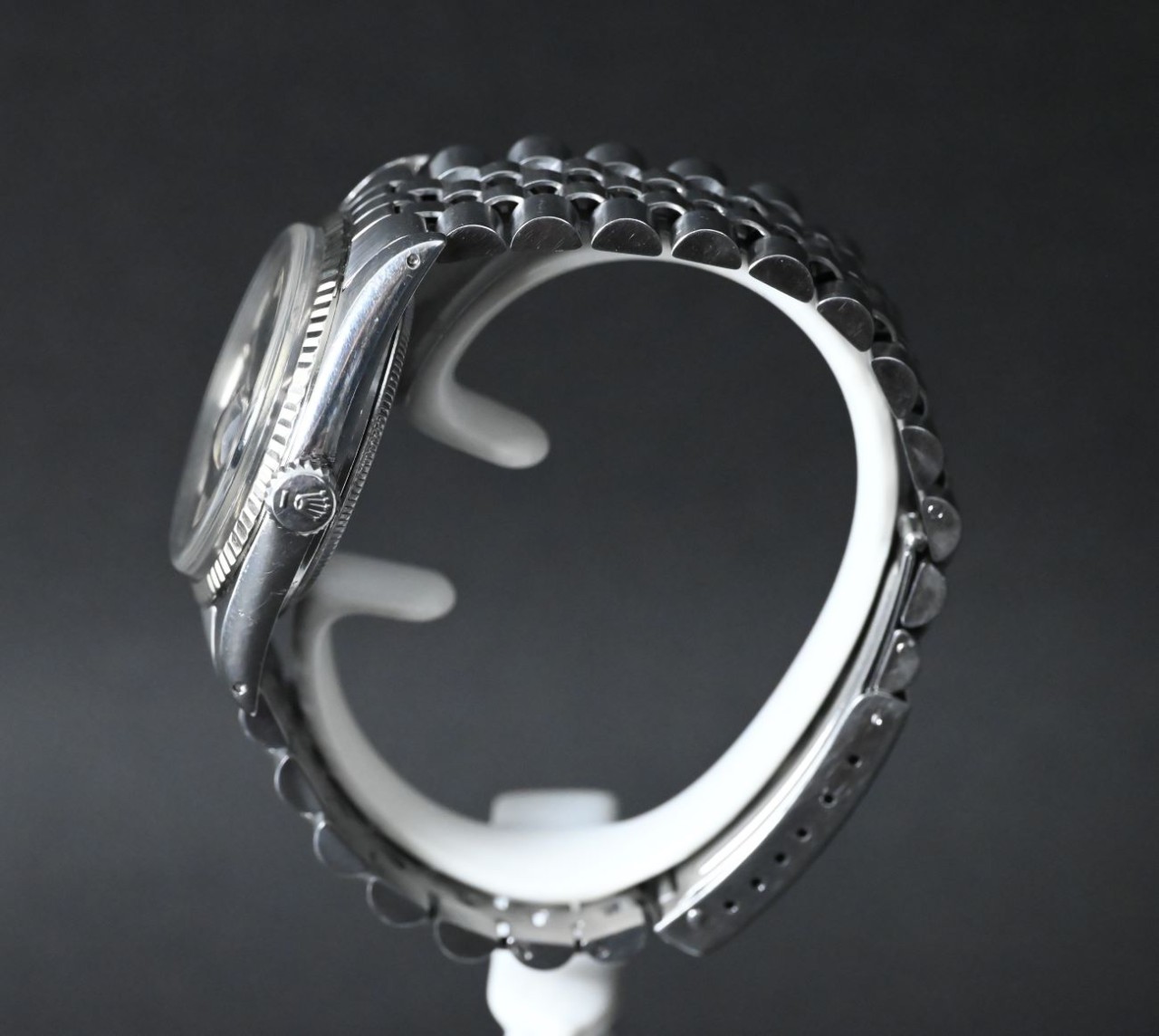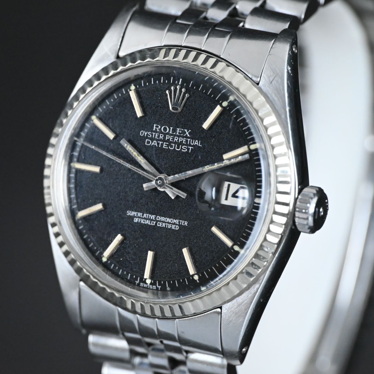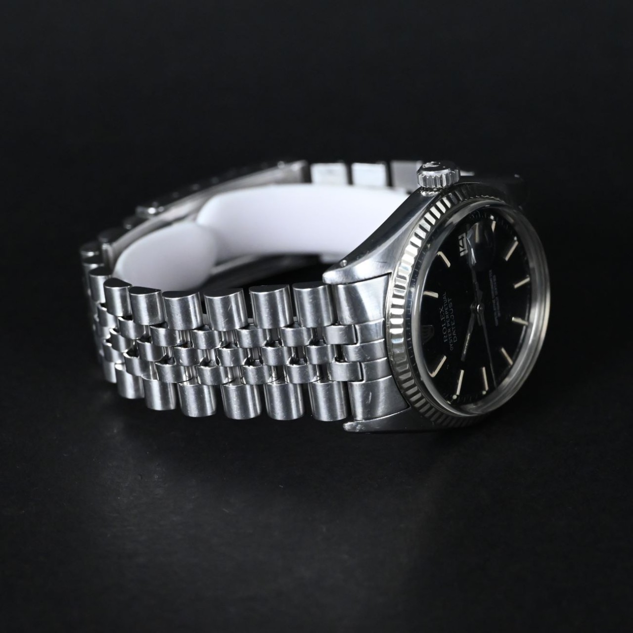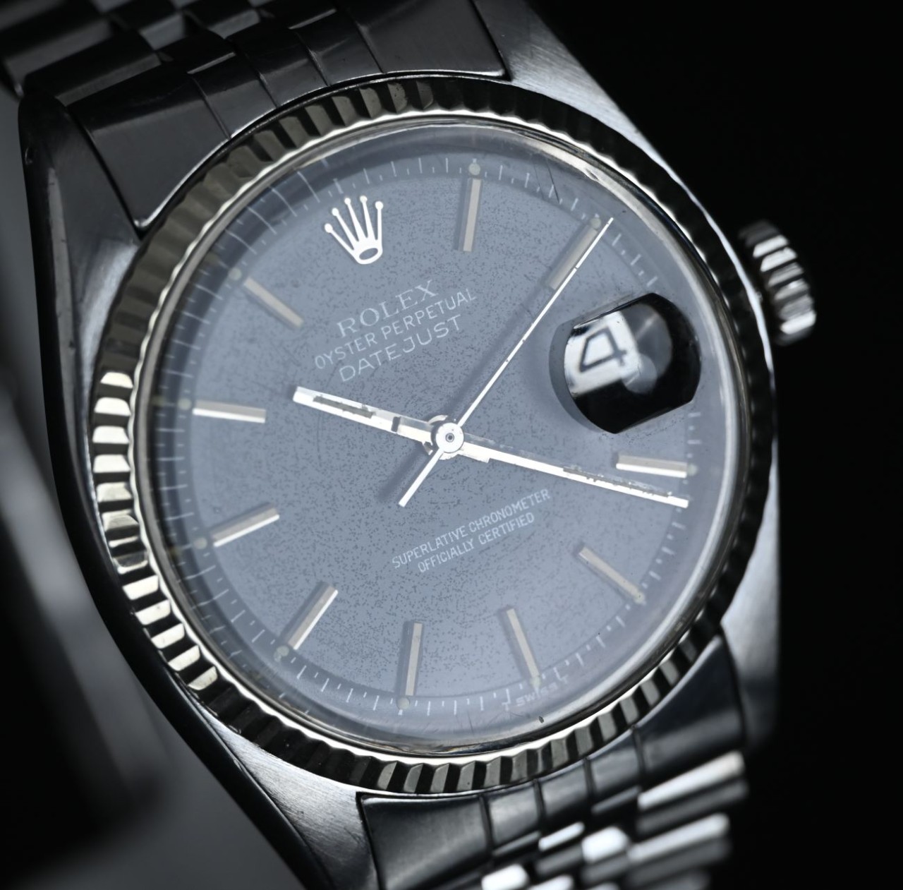 The Rolex Datejust 1601 with a black matte dial carries a classic vintage look that stands out with its simple, clean finish. The 36 mm steel case feels balanced on the wrist, and the white-gold fluted bezel adds a subtle shine without overpowering the dial. Its acrylic crystal gives the watch a warm, retro character with a soft dome that plays gently with the light. Paired with either an Oyster or Jubilee bracelet, the watch offers a comfortable fit and a refined presence
