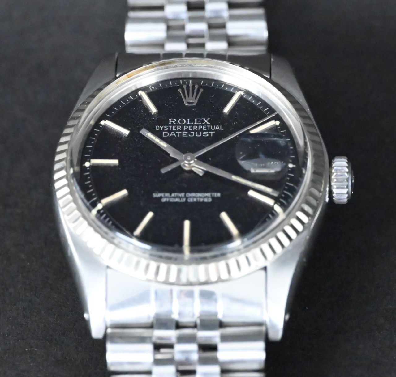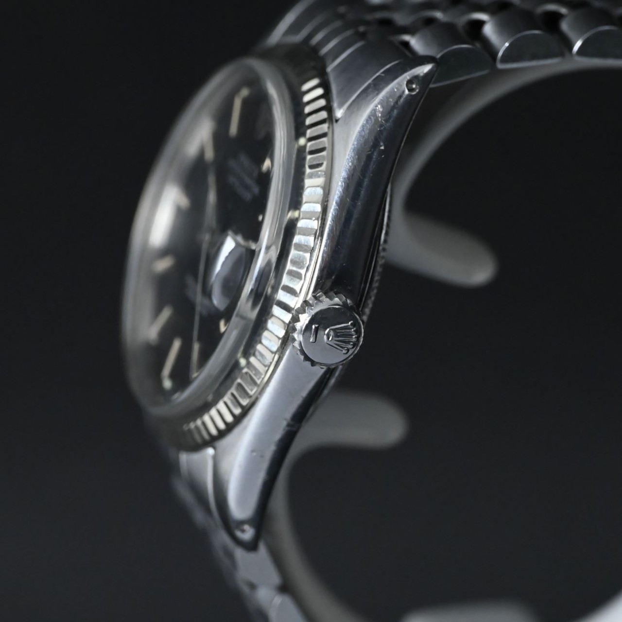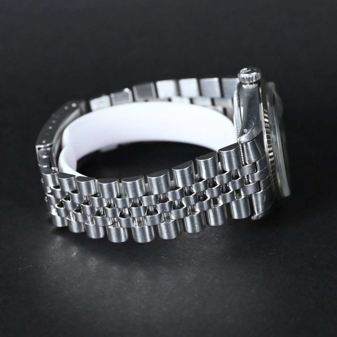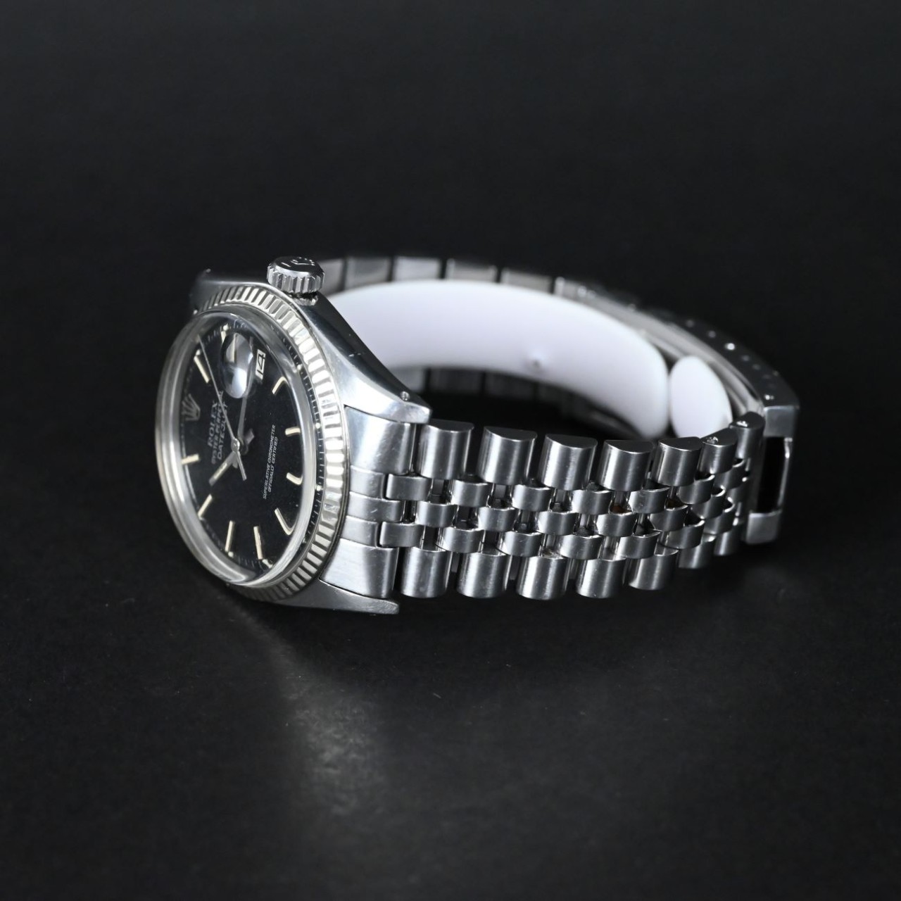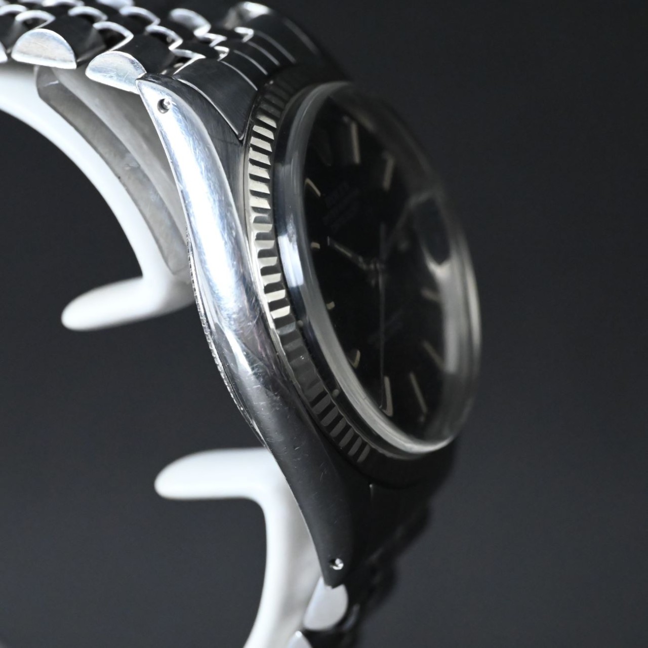 The Rolex Datejust 1601 with a black matte dial carries a classic vintage look that stands out with its simple, clean finish. The 36 mm steel case feels balanced on the wrist, and the white-gold fluted bezel adds a subtle shine without overpowering the dial. Its acrylic crystal gives the watch a warm, retro character with a soft dome that plays gently with the light. Paired with either an Oyster or Jubilee bracelet, the watch offers a comfortable fit and a refined presence