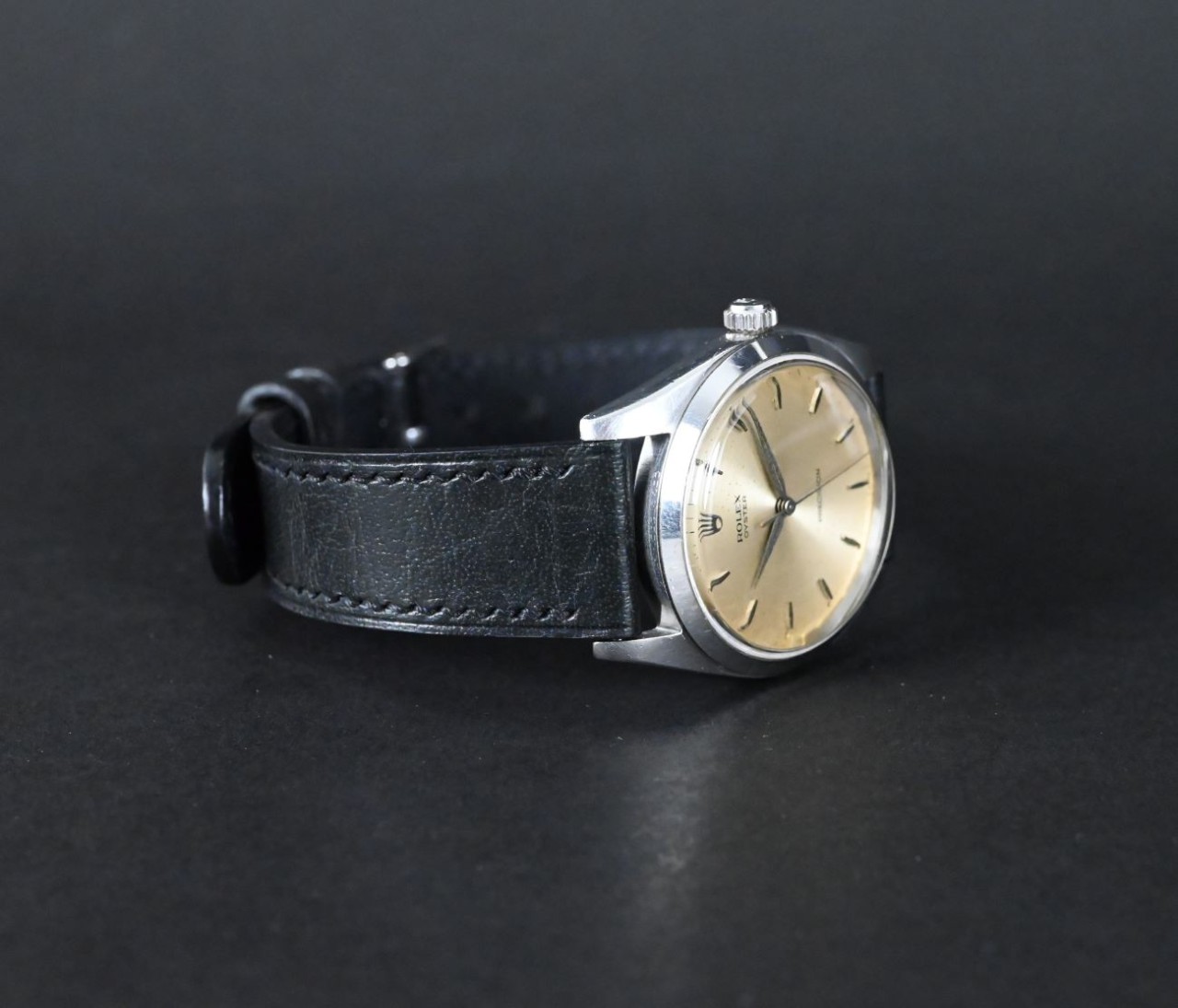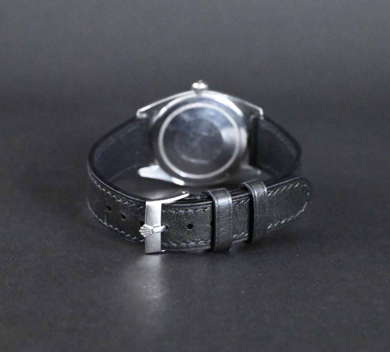 | Bracelet / Strap | Custom-made Black Leather Strap With Aftermarket Market Tang Buckle |