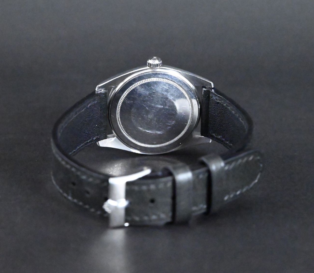 The Rolex Oyster Precision 6424 presents a classic 36mm case, a versatile size that wears well on most wrists. Its stainless steel Oyster case features the brand's signature monobloc middle construction, ensuring robust water resistance. The acrylic crystal, with its characteristic dome, offers a warm, vintage distortion at the edges. On the wrist, the simple three-link Oyster bracelet feels solid and comfortable, securing the watch with a straightforward folding clasp. The clean, uncluttered dial is the star here, with its simple stick markers and plain baton hands, providing perfect, legible simplicity