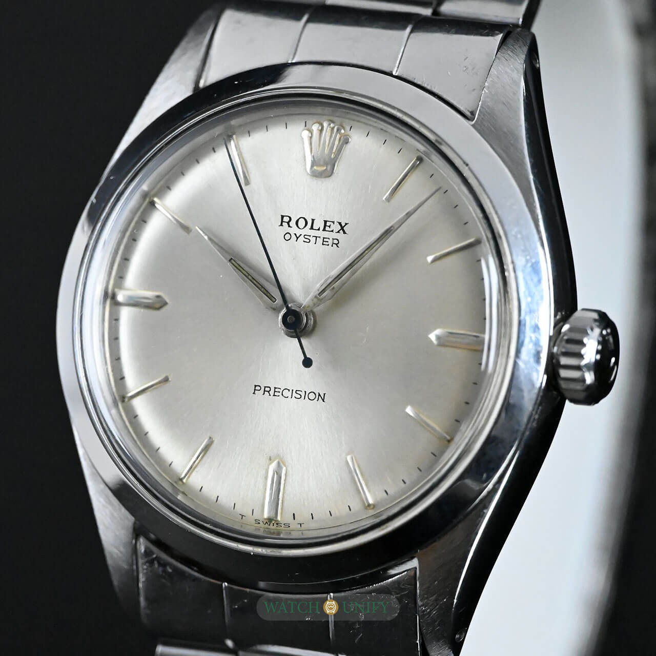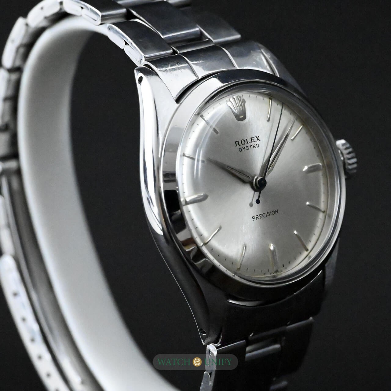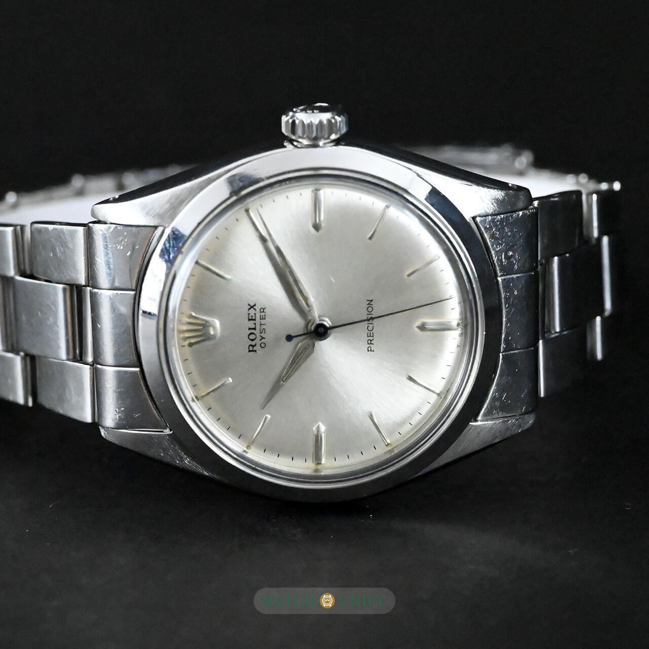 The Rolex Oyster Precision 6480 is a fine example of classic simplicity and understated design. Its silver sunburst dial catches the light beautifully, giving it a soft and elegant glow. The minimalist hour markers and thin hands add to its refined look, while the polished stainless steel case enhances its timeless appeal. The crystal is made of acrylic, typical of watches from its era, giving it a warm vintage charm. The matching Oyster bracelet completes the look, providing both comfort and durability, with solid links that retain Rolex's signature robustness.