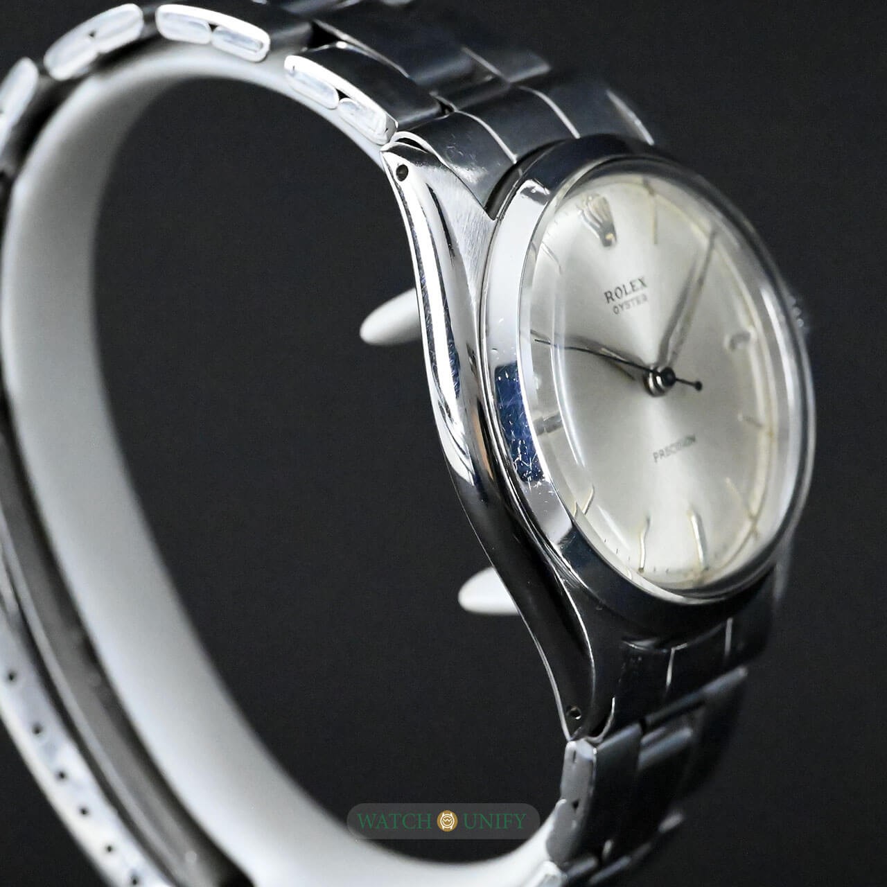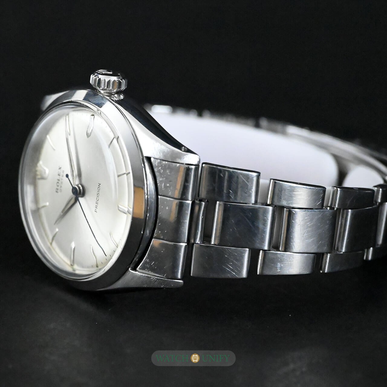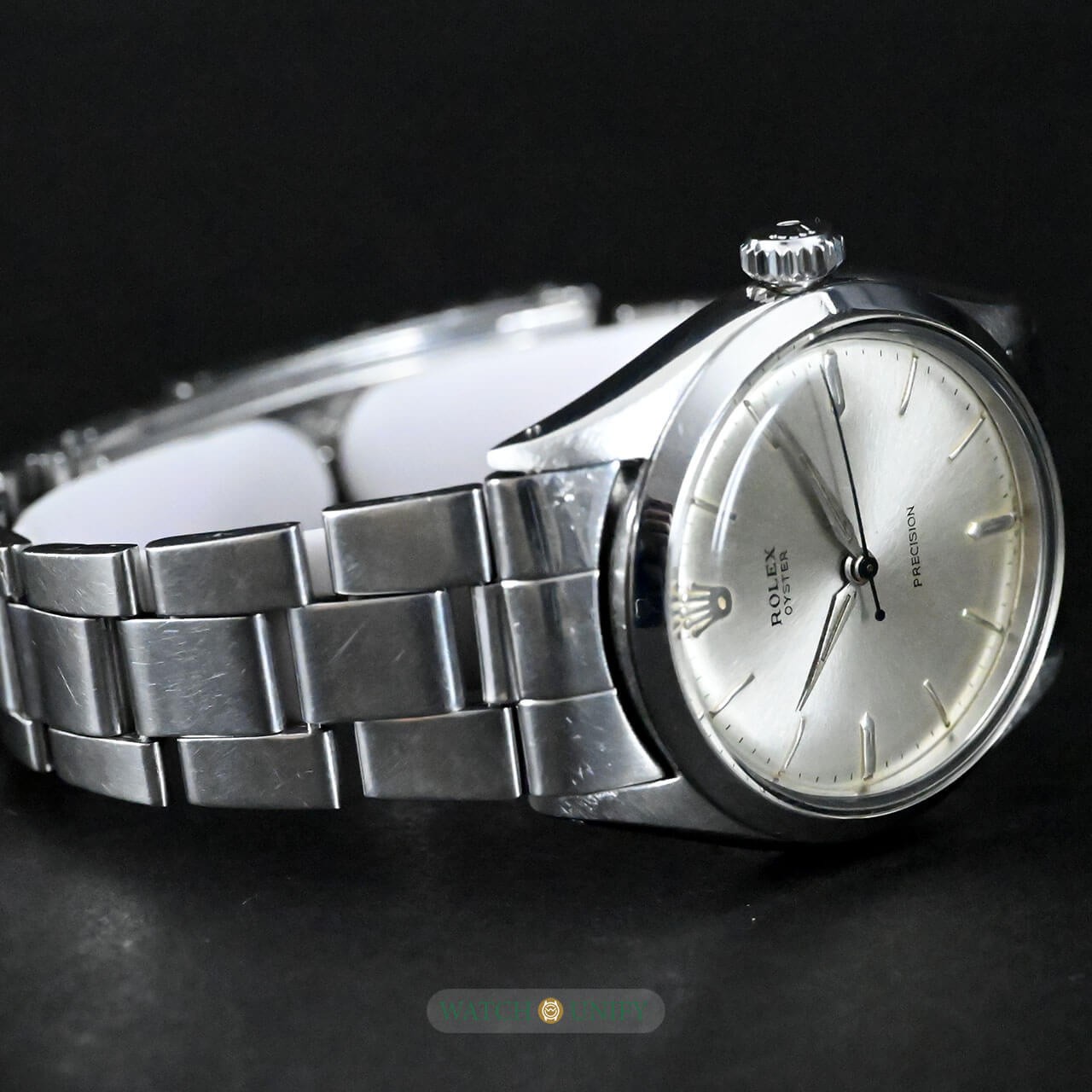 The Rolex Oyster Precision 6480 is a fine example of classic simplicity and understated design. Its silver sunburst dial catches the light beautifully, giving it a soft and elegant glow. The minimalist hour markers and thin hands add to its refined look, while the polished stainless steel case enhances its timeless appeal. The crystal is made of acrylic, typical of watches from its era, giving it a warm vintage charm. The matching Oyster bracelet completes the look, providing both comfort and durability, with solid links that retain Rolex's signature robustness.