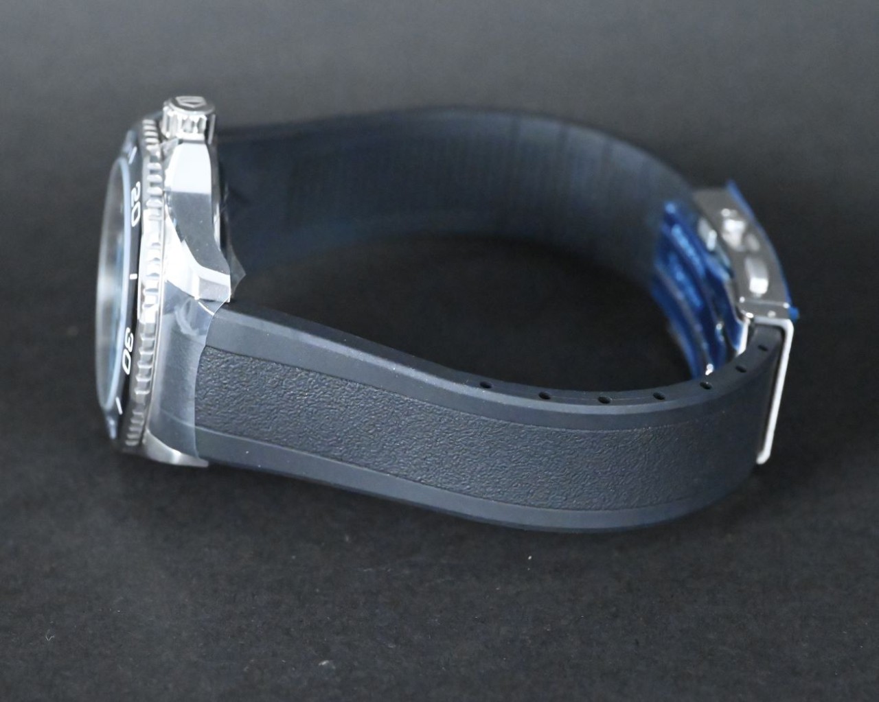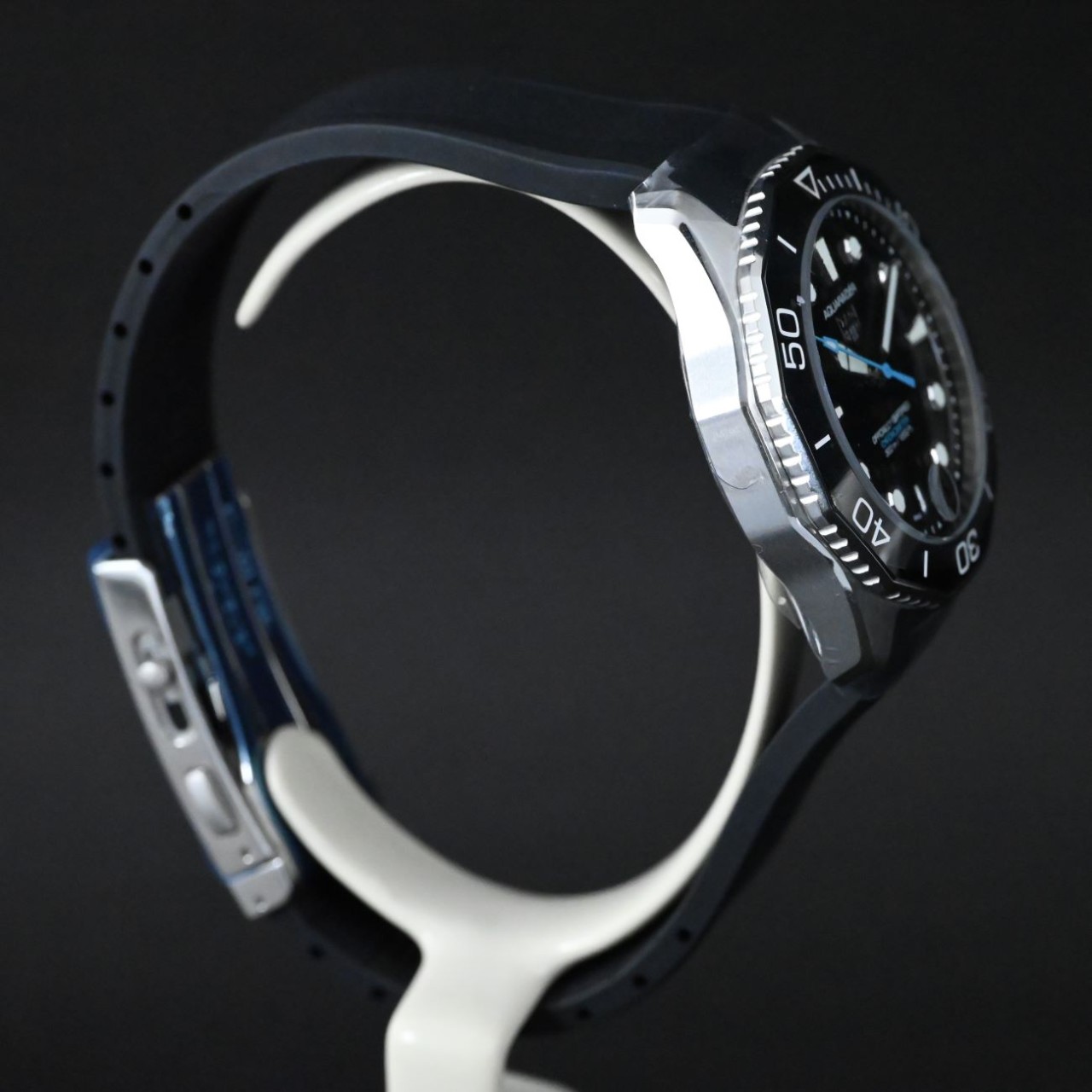 The watch has a striking black dial with a wavy pattern that adds depth and character to its face. Large luminescent hands and applied indexes make it easy to read in bright light or underwater, and the date window at 6 o’clock stays balanced and clear. The 42 mm stainless steel case feels solid and well-finished with fine brushing and polishing, while the black ceramic unidirectional bezel turns with a reassuring click for dive timing. A sapphire crystal with anti-reflective coating protects the dial, and the comfortable black rubber strap with a folding clasp holds the watch securely on your wrist.