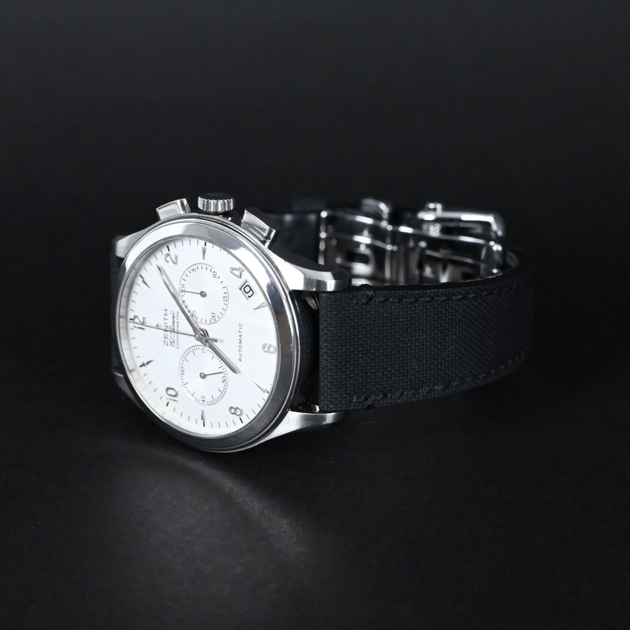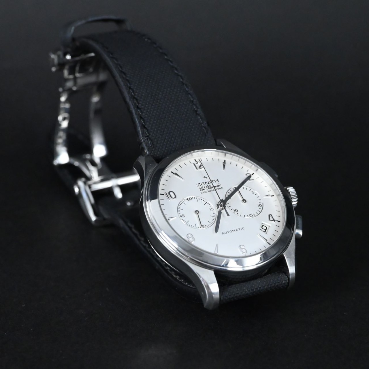 The dial of this Zenith El Primero Class Chronograph is clean and classic, usually seen in black or silver, with clear chronograph subdials and a date window that make time easy to read. The 40 mm steel case feels solid on the wrist and has a smooth, polished finish that gives the watch a refined look. A sapphire crystal covers the dial, keeping it safe from scratches while offering a clear view in bright light. The watch can come on a steel bracelet or a leather strap, both of which match the case well and feel comfortable, and the bracelet versions usually include a secure folding clasp that adds confidence when wearing it.