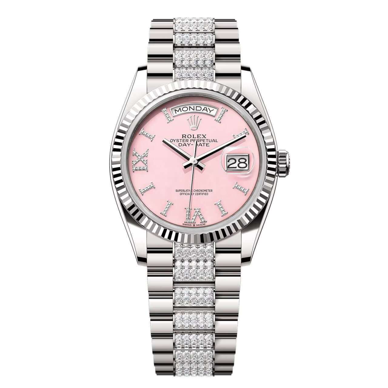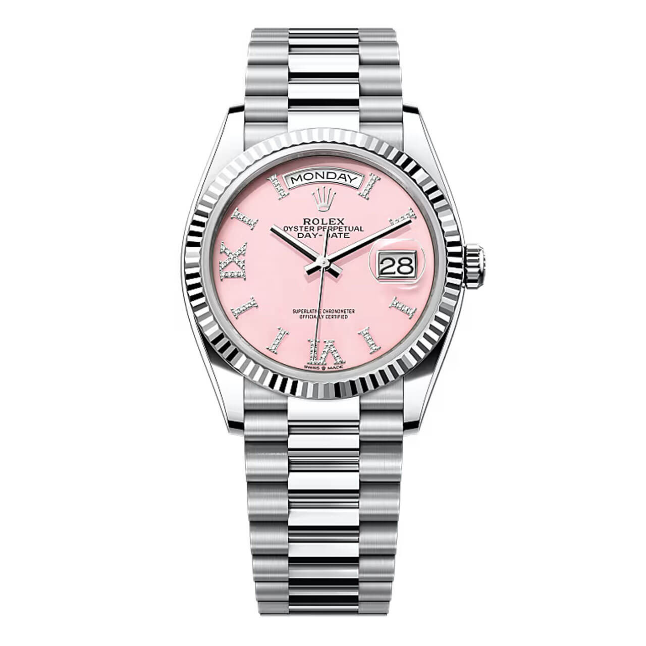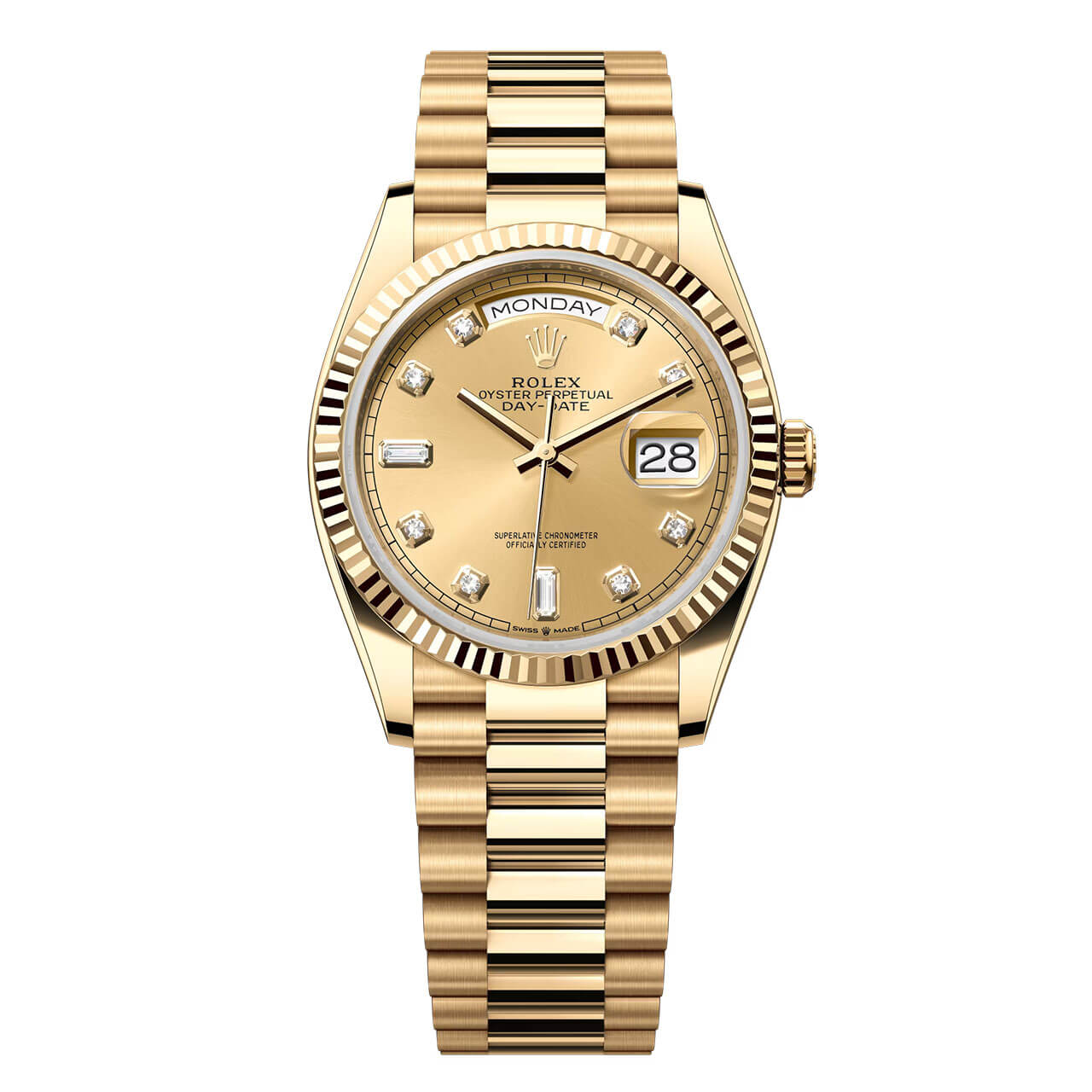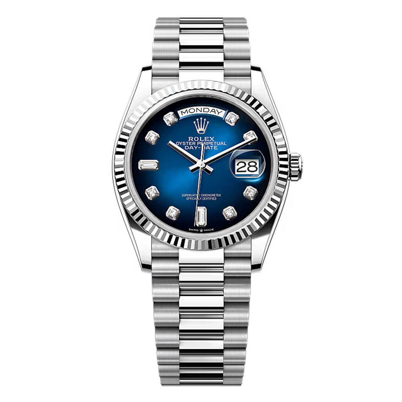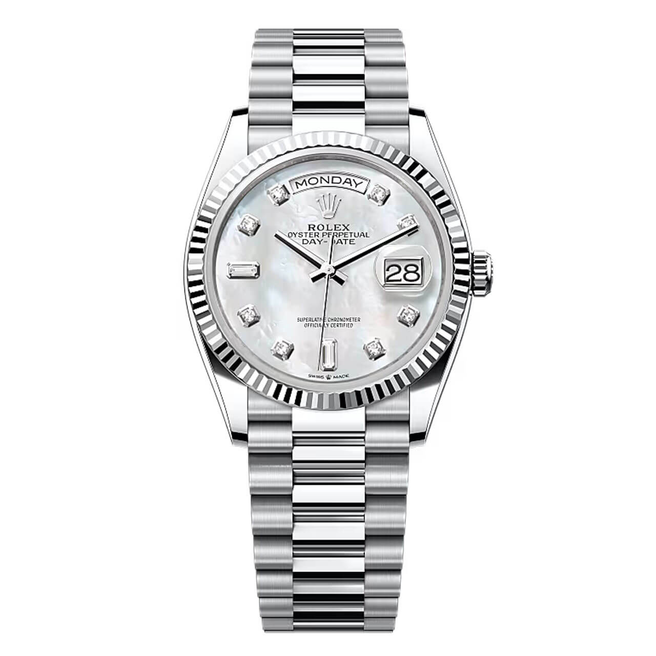 Introduced in 1956, the Rolex Day-Date was the very first self-winding wristwatch to feature not only a date window but also a window for the day of the week, spelt out in full and offered today in 26 languages. The Day-Date is the only model that Rolex has never offered for sale in steel – only gold and platinum, hence it was associated with power and success and found its way onto the wrists of many American presidents. Consequently, Rolex dubbed the Day-Date’s bracelet the President, though this nickname has spilled over to cover the whole watch in collector conversations.